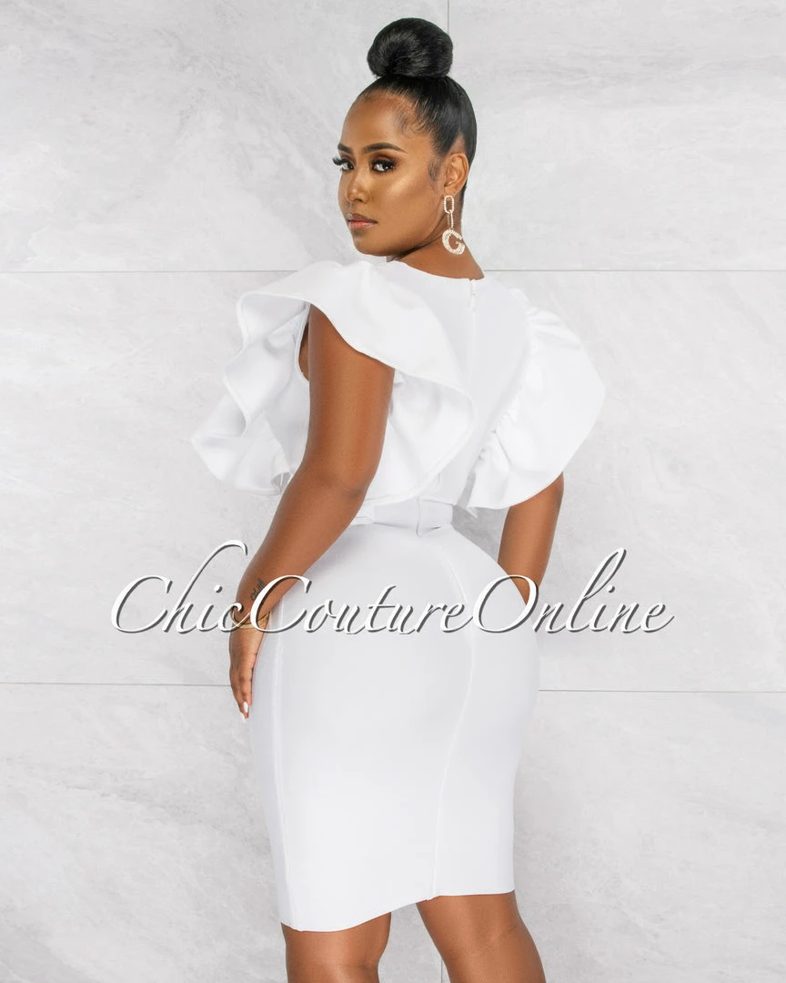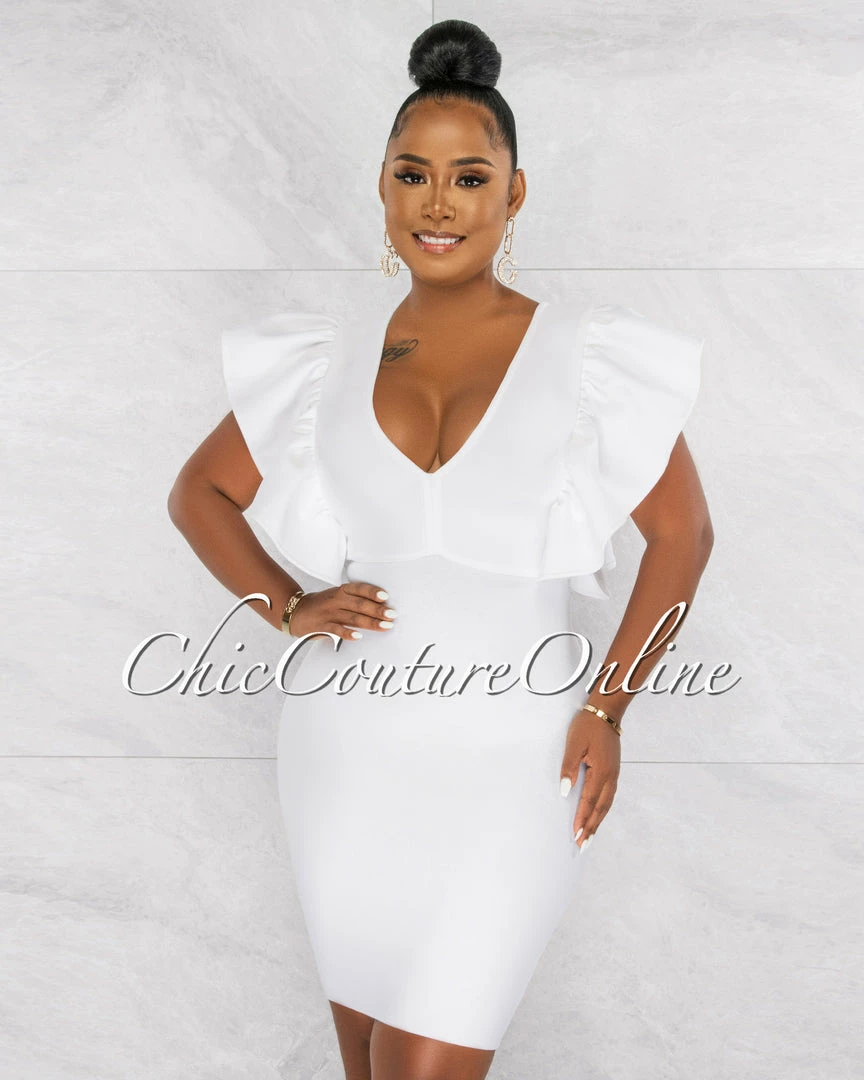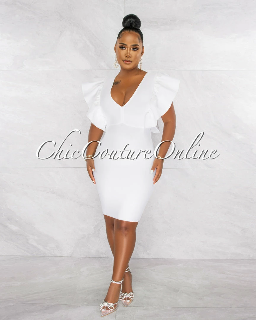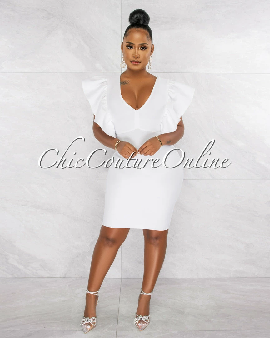 Chic Couture Online Barend Off-White V-Neck Ruffle Sleeves Bandage Midi Dress JUST IN