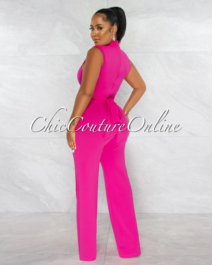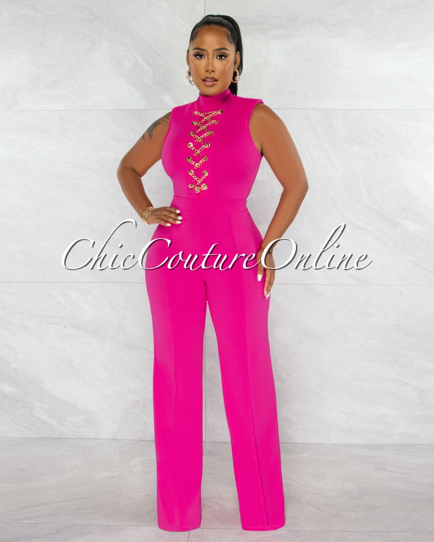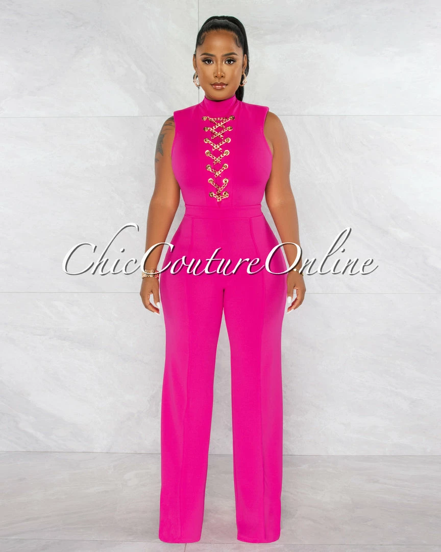 Chic Couture Online Brandy Fuchsia Gold Link Lace-Up Jumpsuit JUST IN