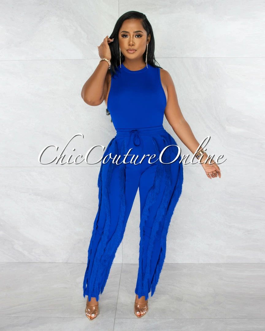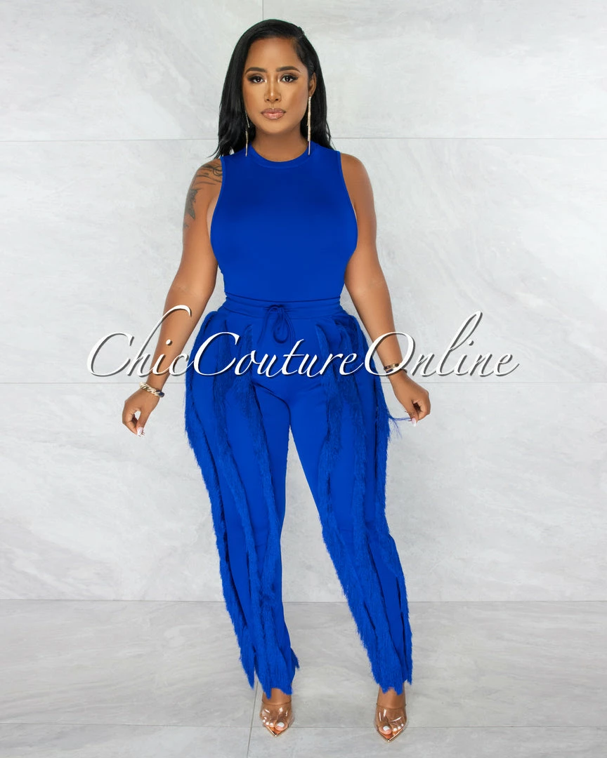 Chic Couture Online Janiel Royal Blue Bodysuit & Fringe Pants Set