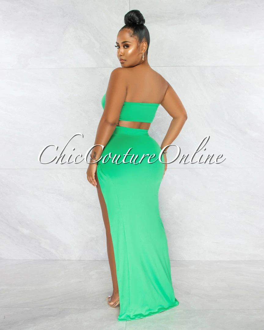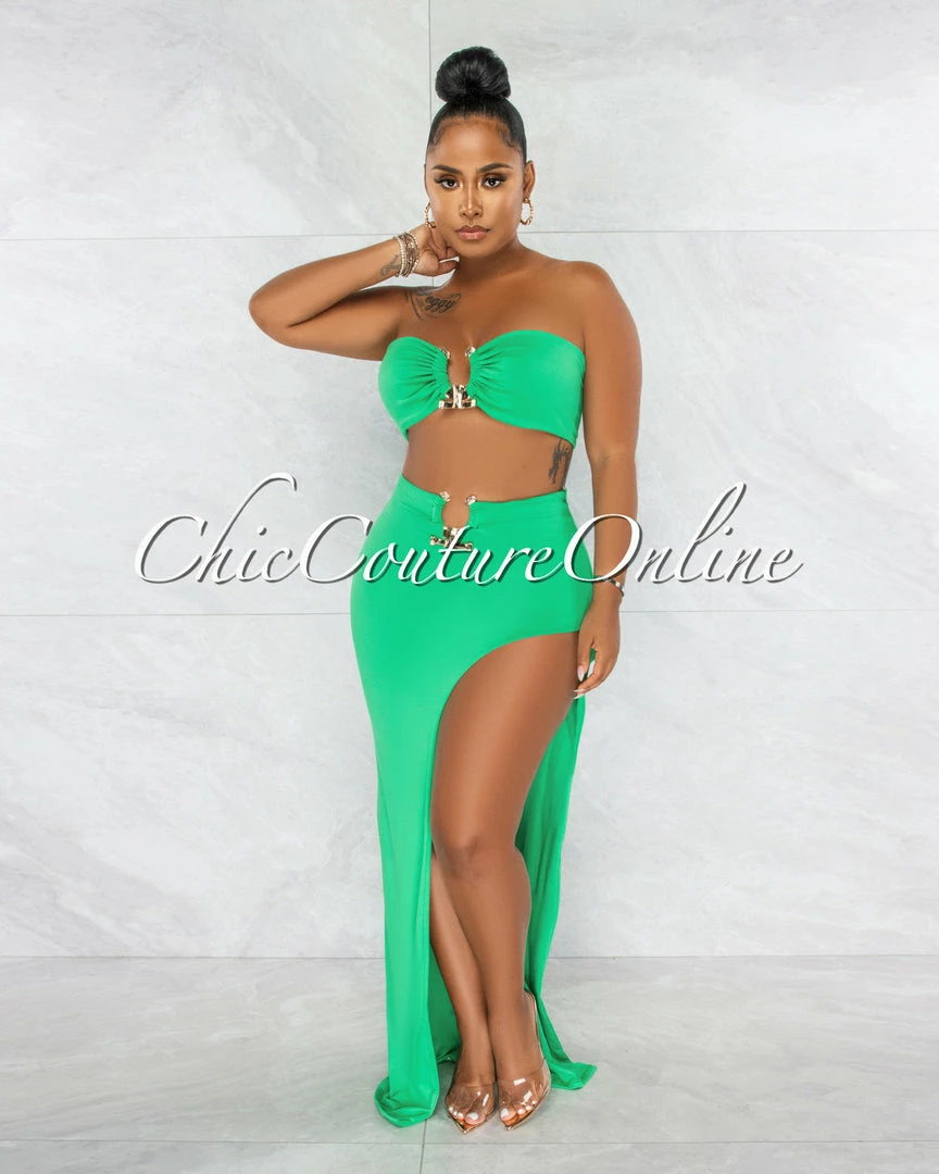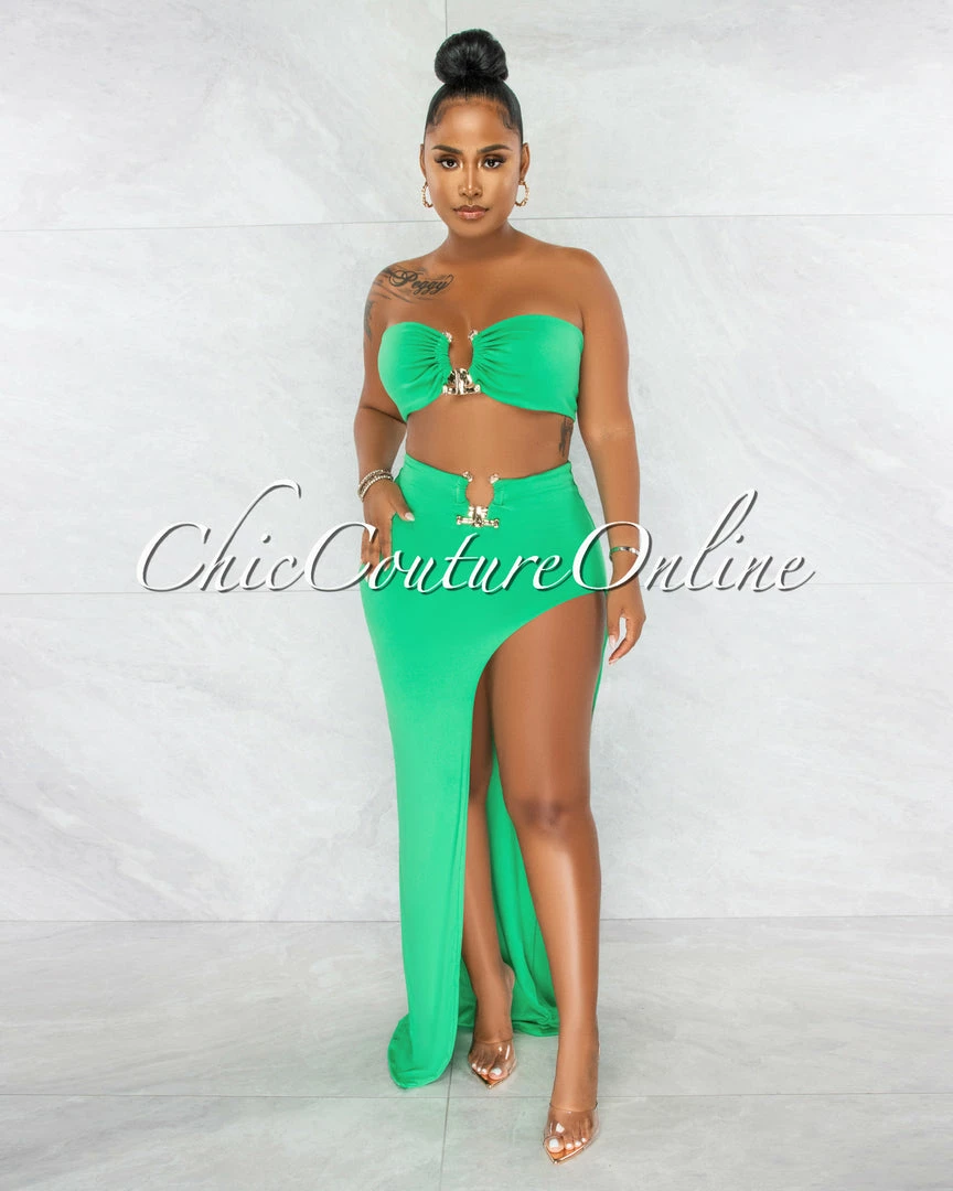 Chic Couture Online JUST IN Alyza Kelly Green Gold Accent Top & Maxi Slit Skirt Set
