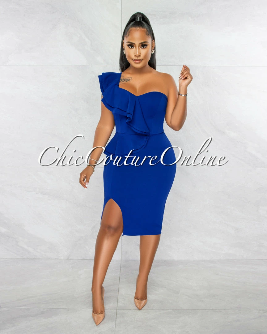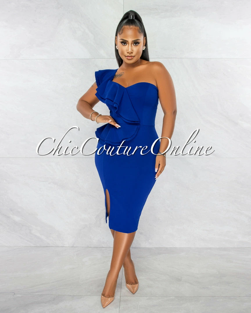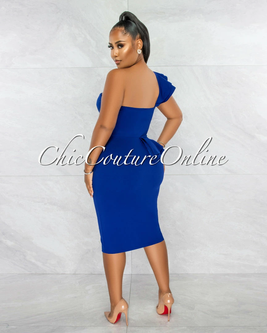 Chic Couture Online JUST IN Corin Royal Blue Single Shoulder Ruffle Midi Dress