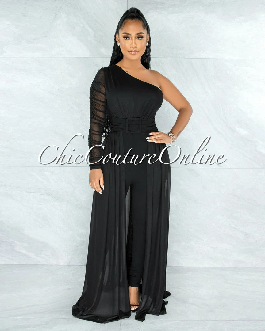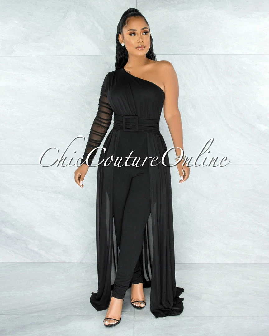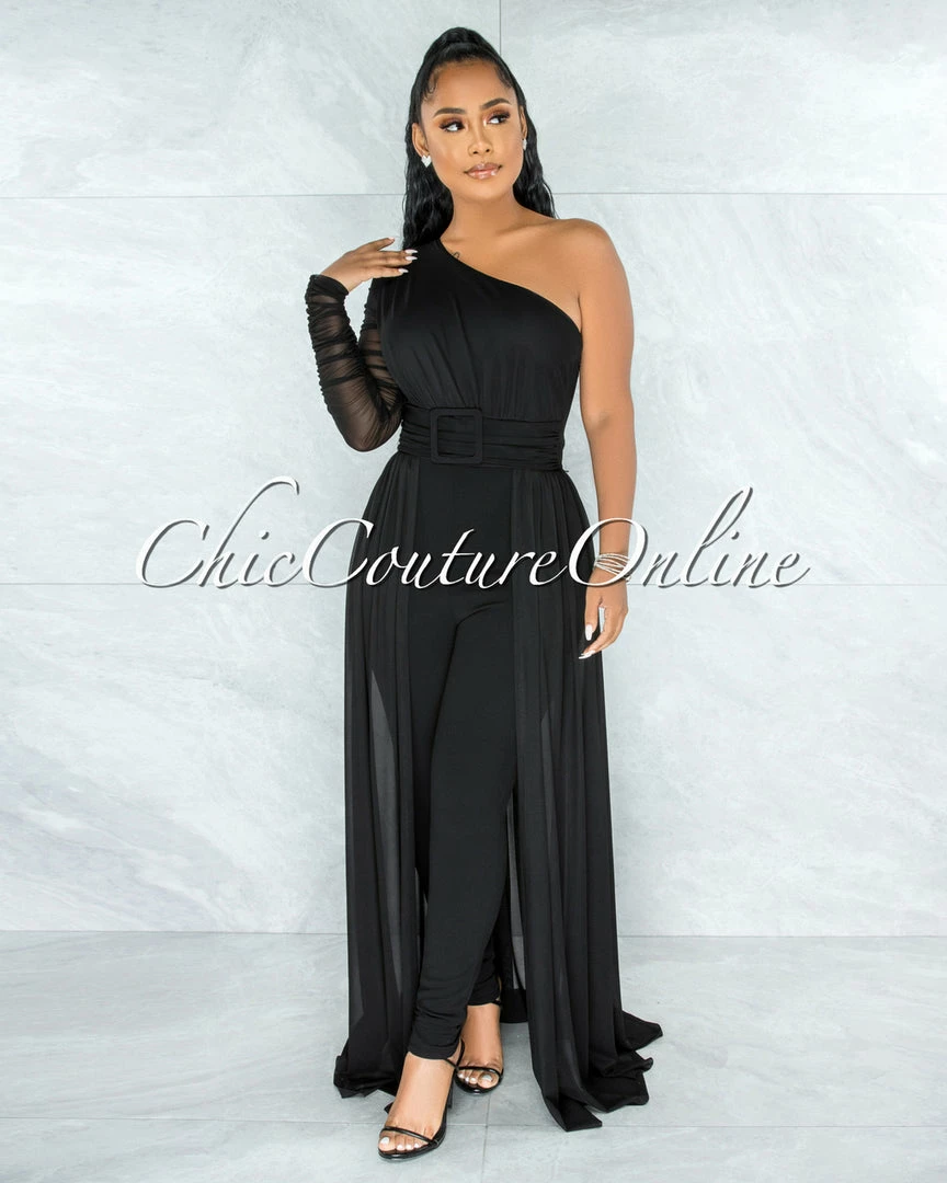 The look of a ball gown with the comfort of pants is yours in this overlay detail jumpsuit. The dramatic buckle and long sleeves are very Hollywood, making this jumpsuit your go-to piece when your event requires sophisticated grace. The slimming overlay makes this style flattering for every body!