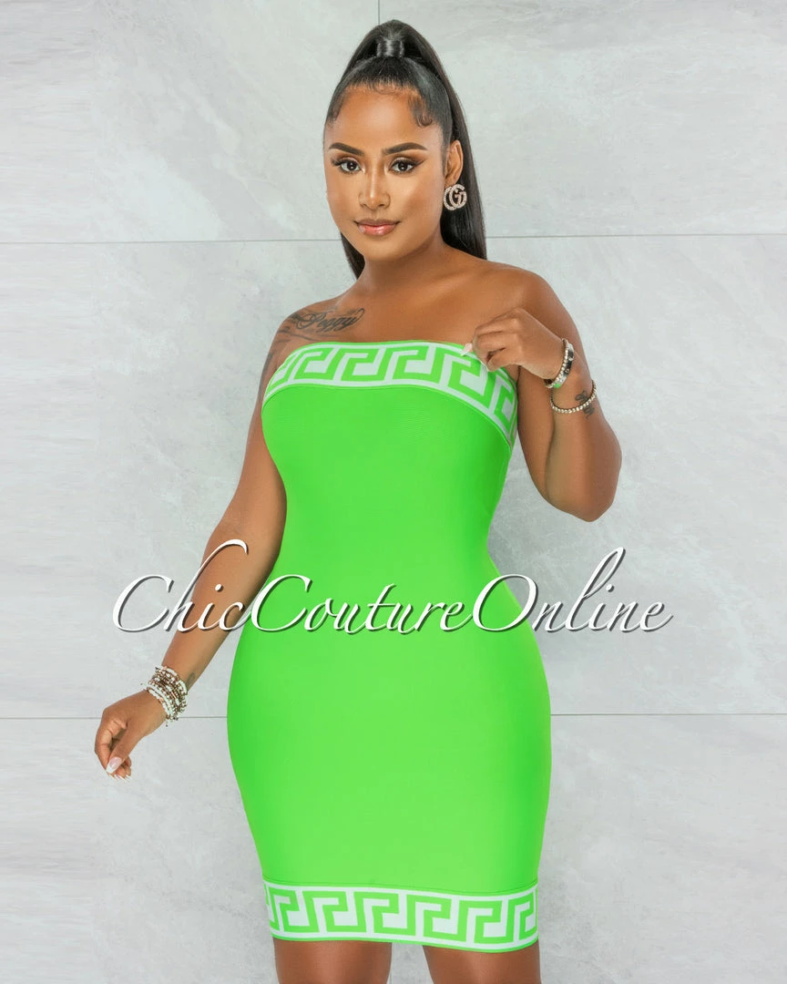 Chic Couture Online Rokka Green White Fret Print Strapless Bandage Dress