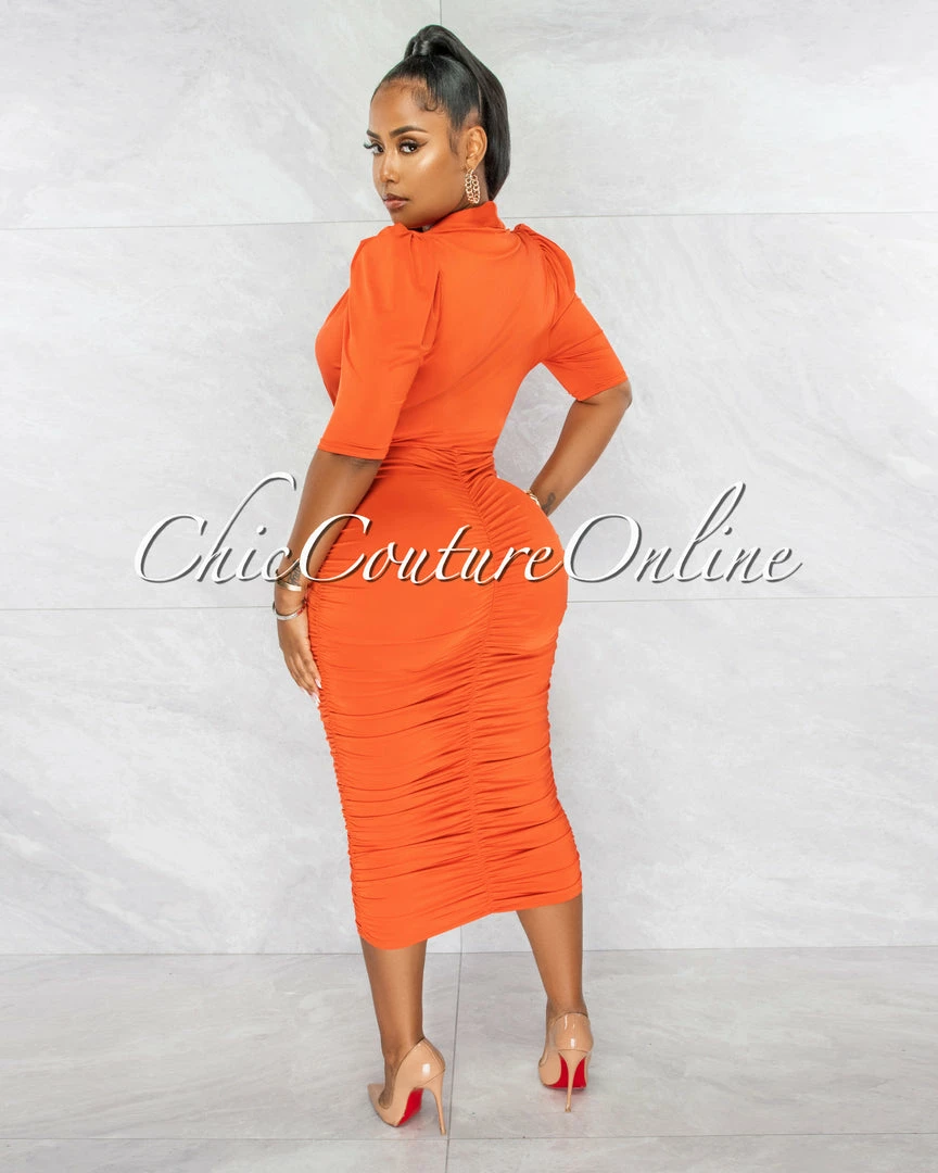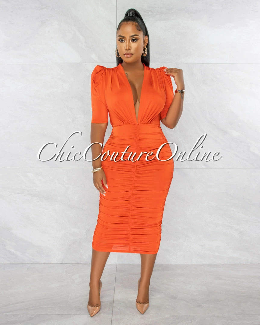 Chic Couture Online Sandy Orange Deep V-Neck Padded Shoulders Midi Dress