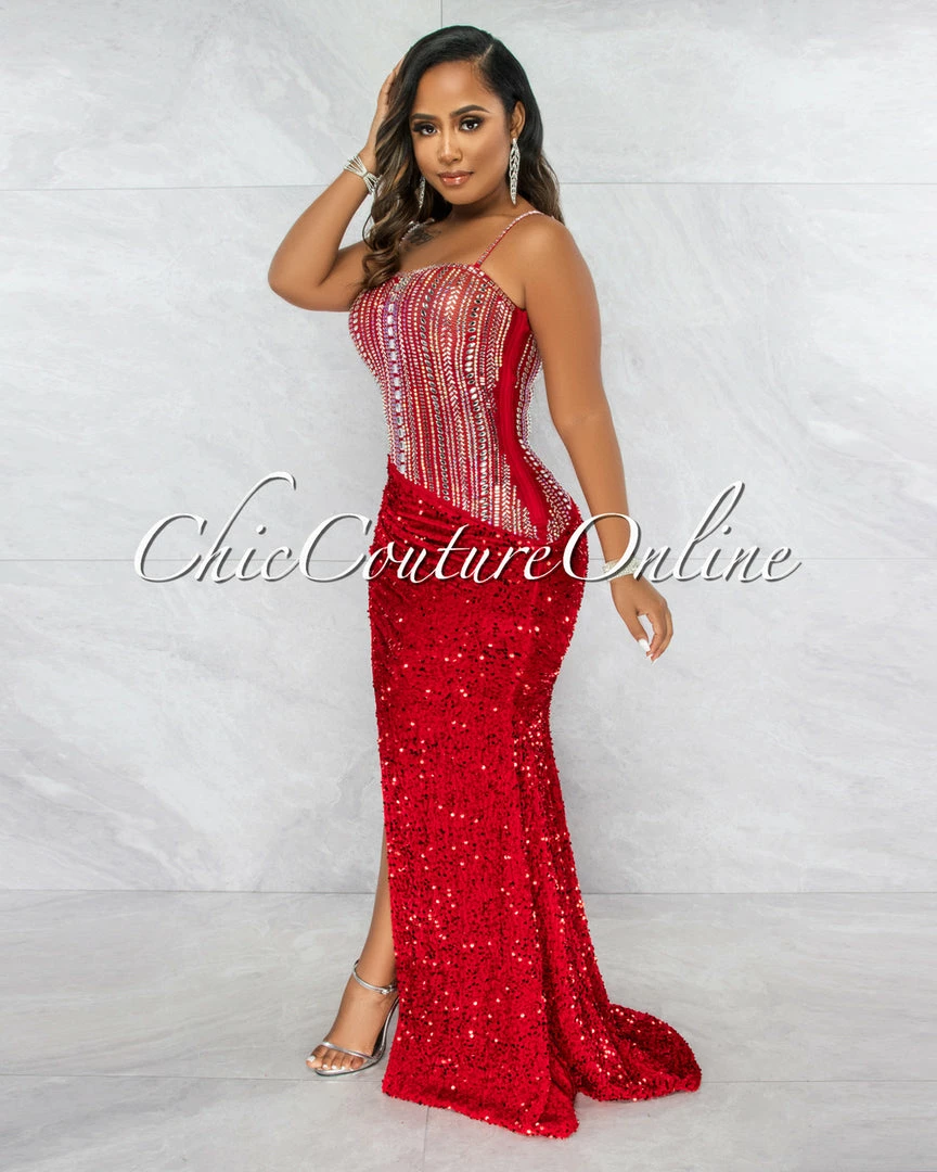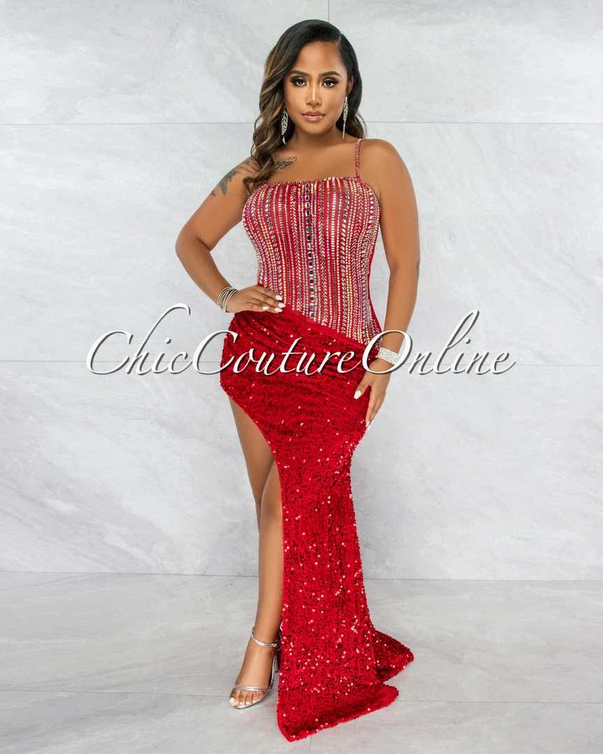 Vendor-unknown Castro Red Rhinestones Sequins Maxi Dress