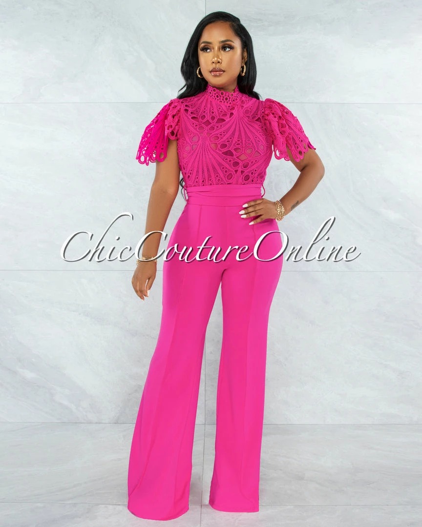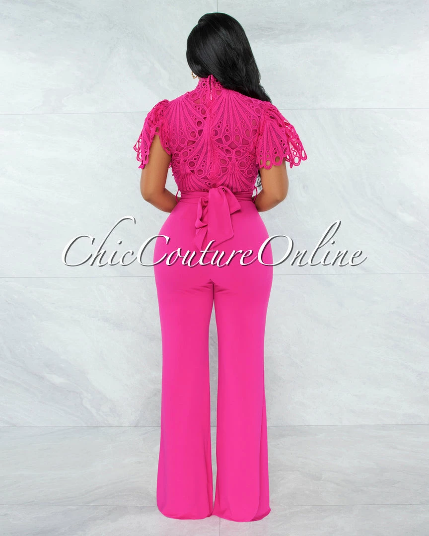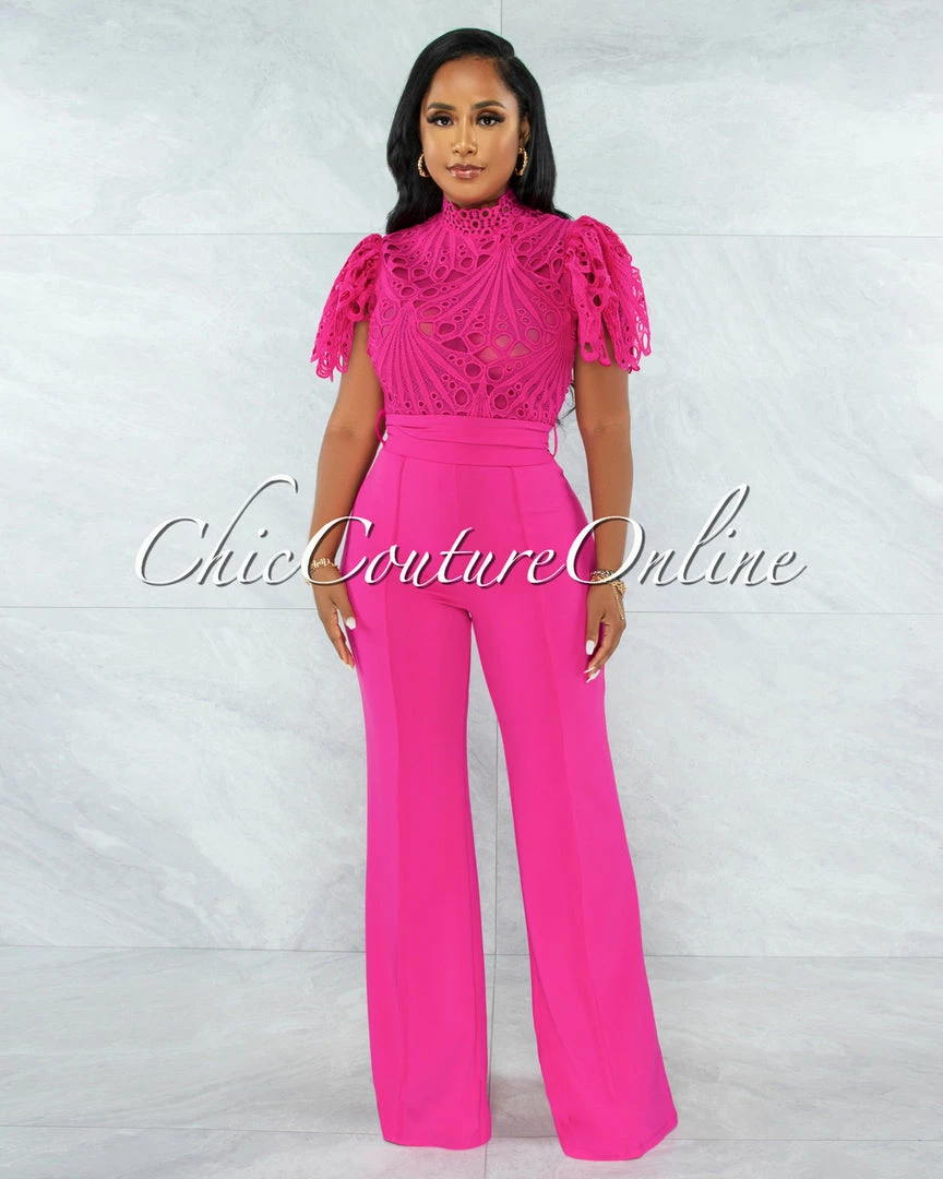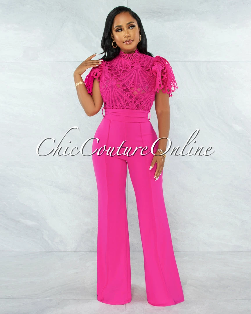 Vendor-unknown Charity Fuchsia Crochet See-Thru Top Ruffle Sleeves Jumpsuit JUST IN