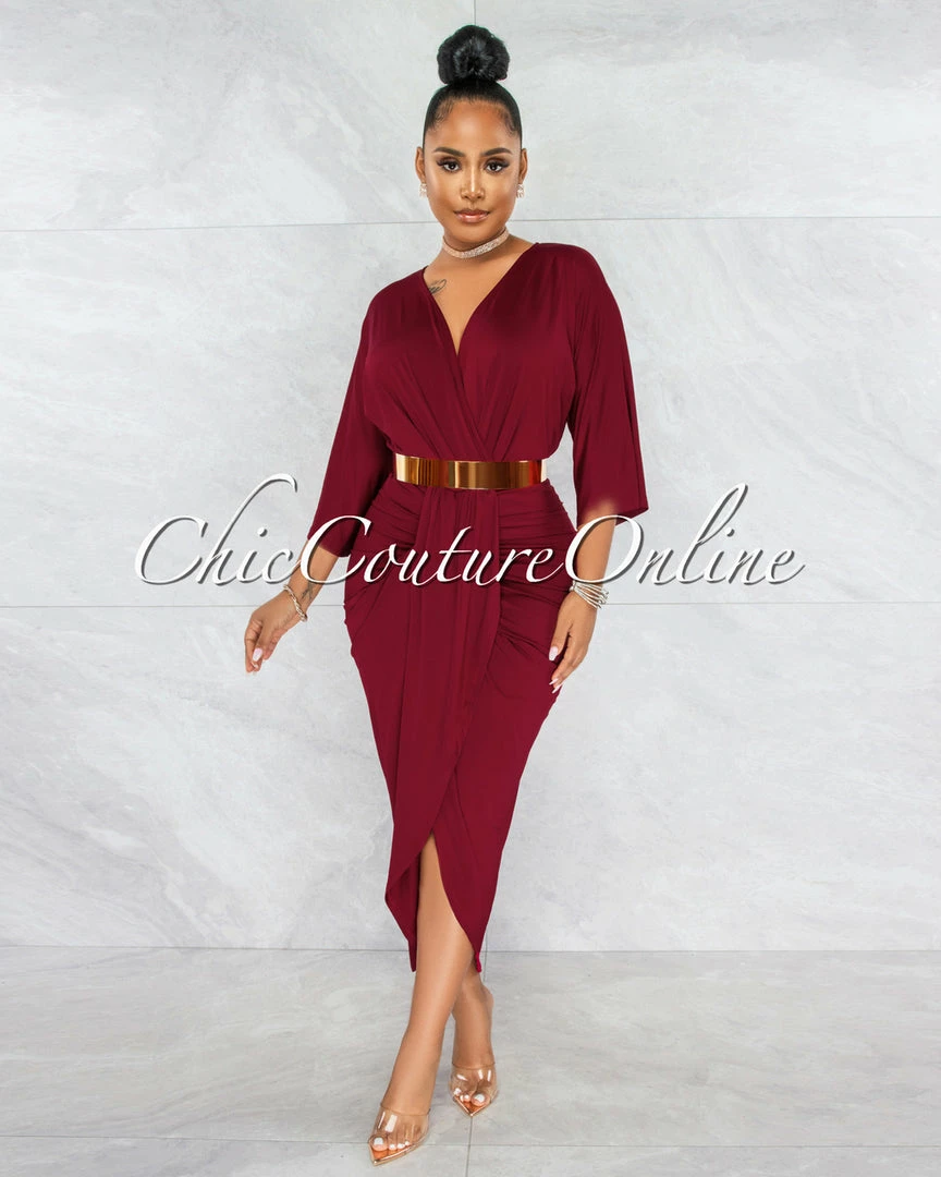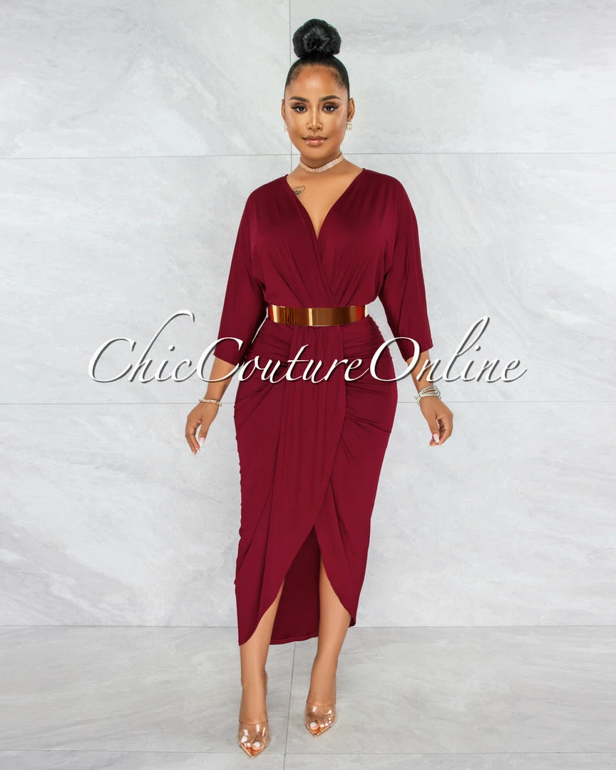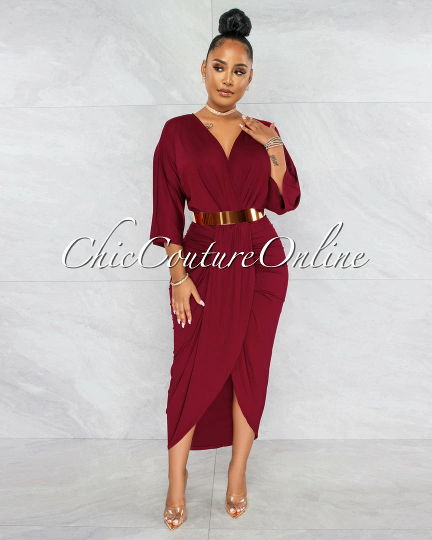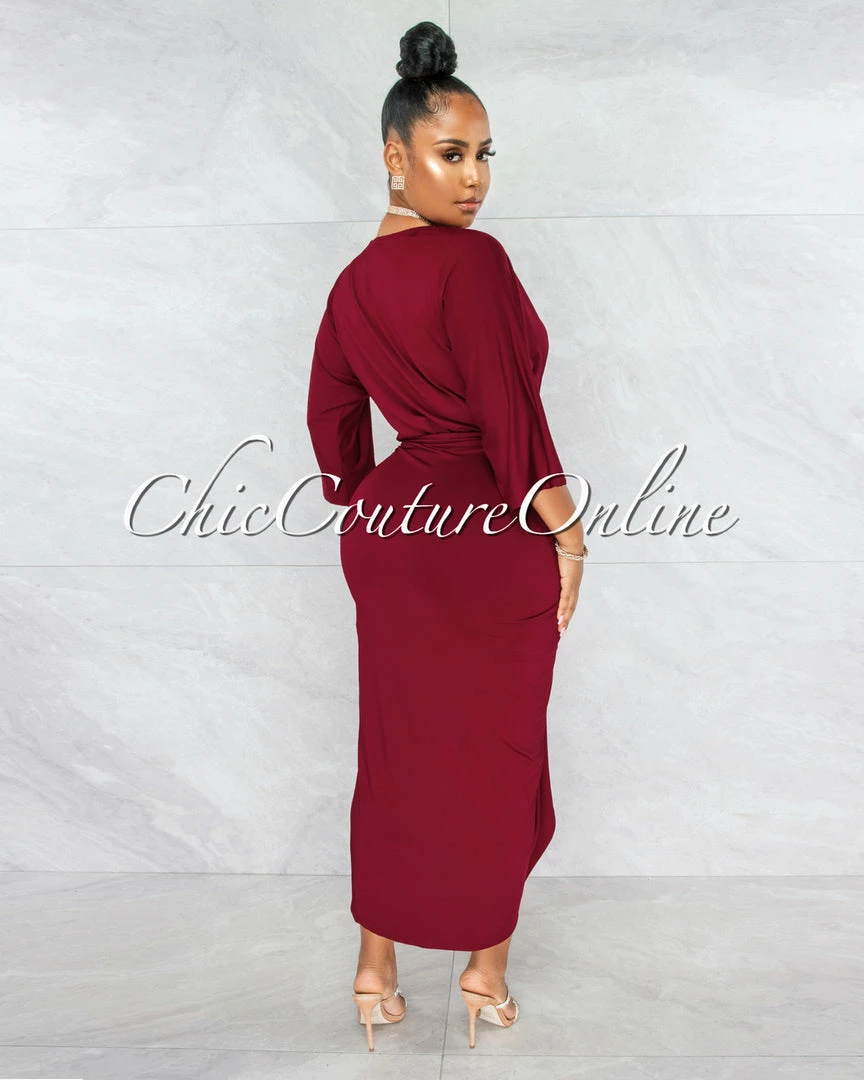 Featuring a V neckline, knotted front detailing, and full-length maxi with front slit, the gorgeous cut and design of this silhouette makes this dress a true stunner all on its own.