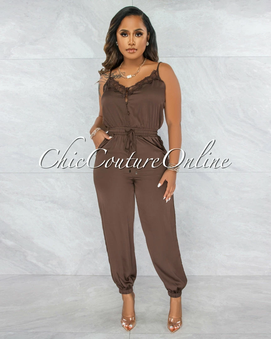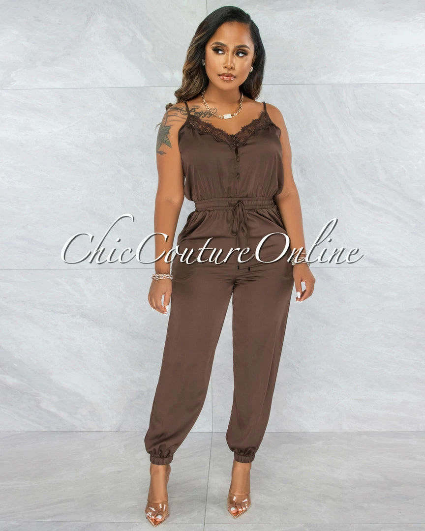 Vendor-unknown Denah Chocolate Lace Satin Jogger Jumpsuit JUST IN