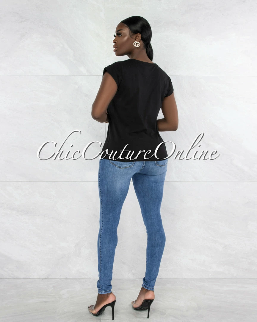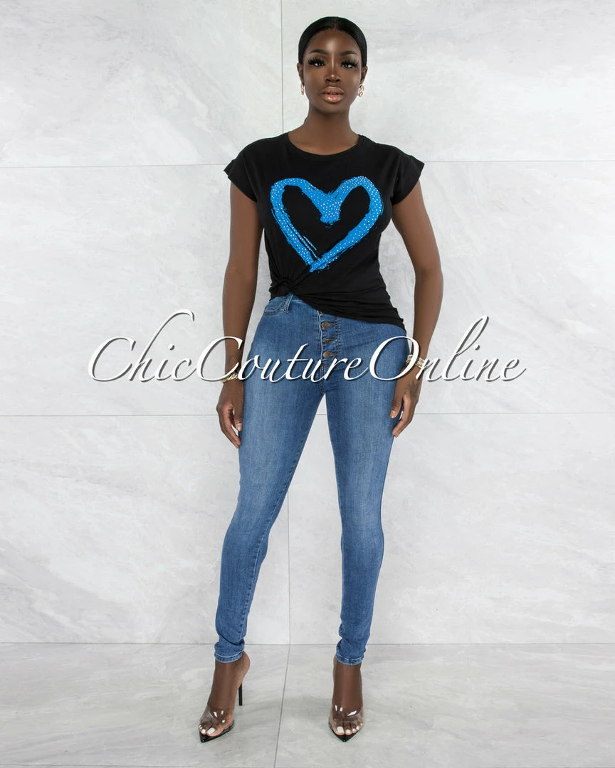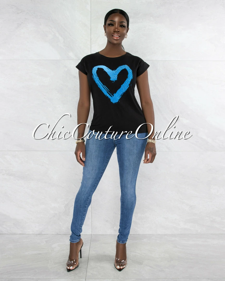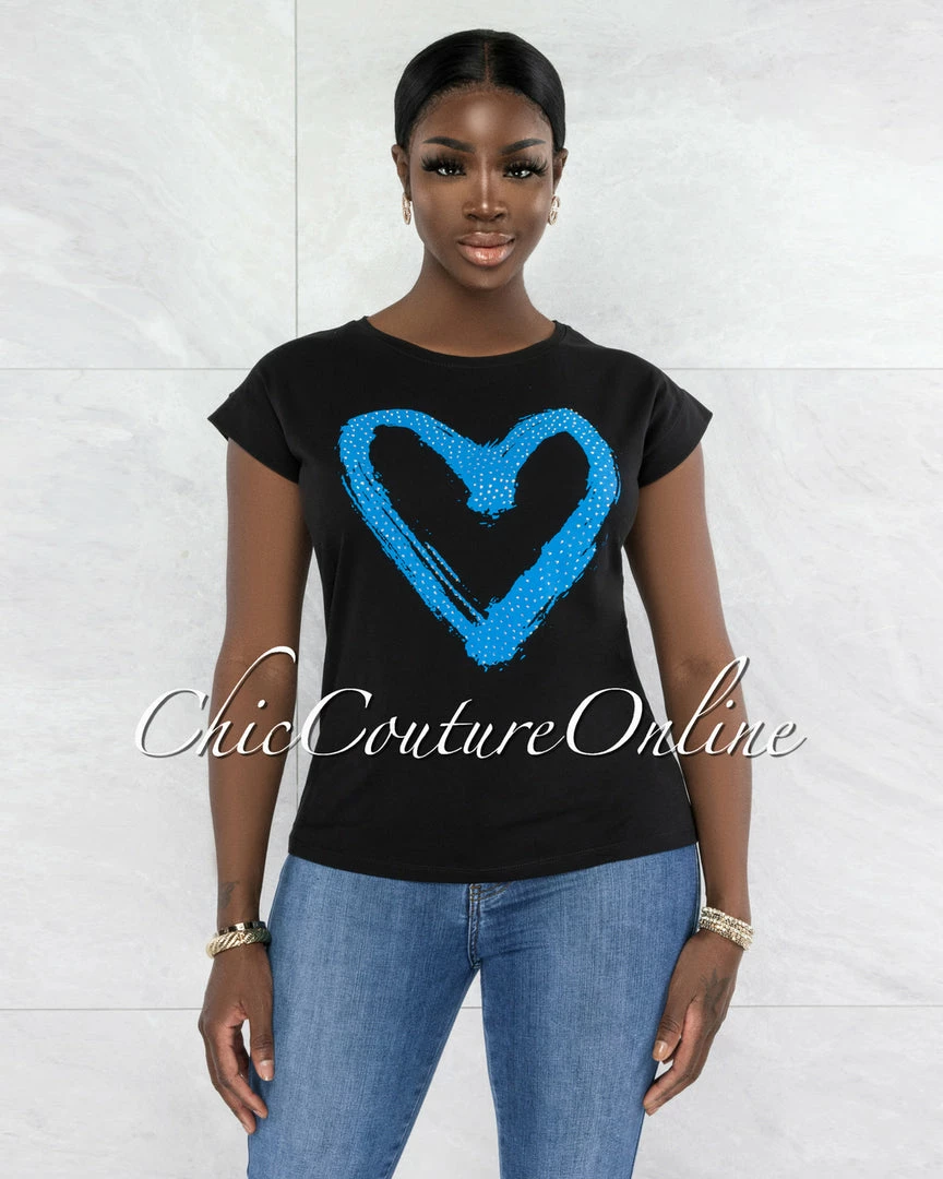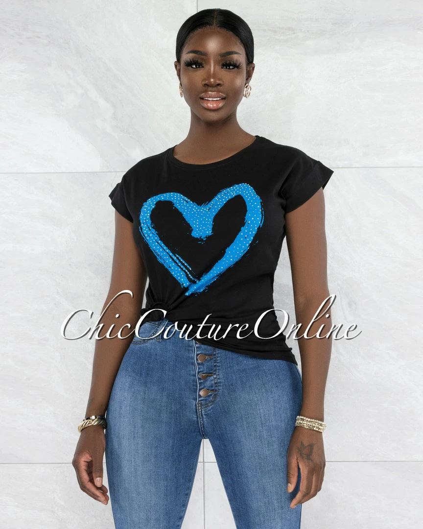 Vendor-unknown Farry Black Blue Front Graphic Rhinestones T-Shirt