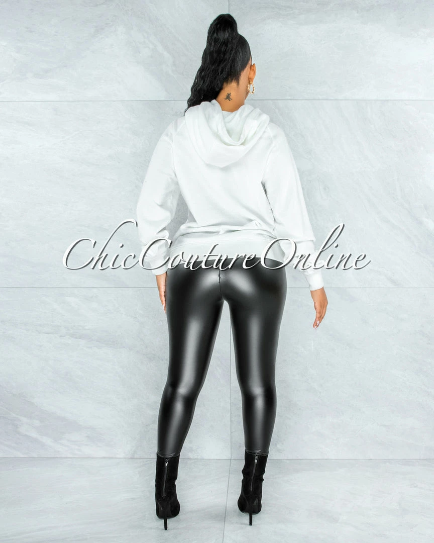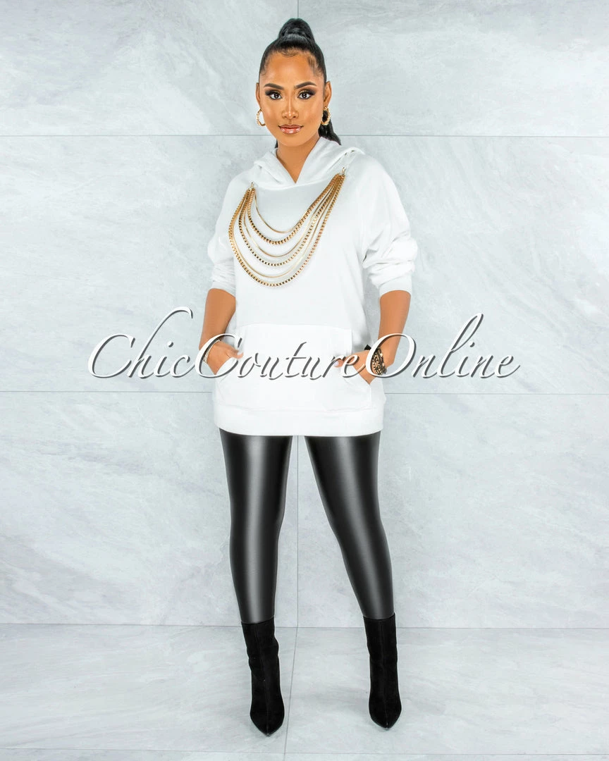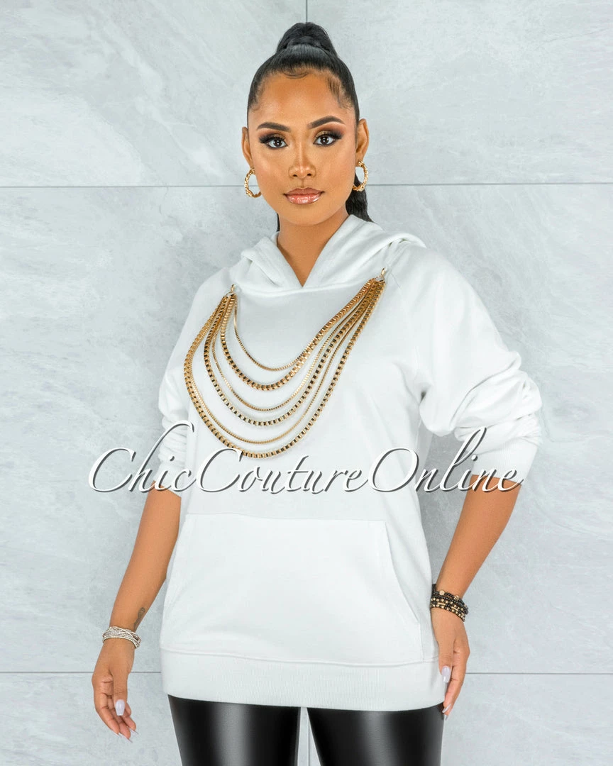 Chill out in this hooded sweater with functional front pockets and long sleeves. Featured with a gold layered link.