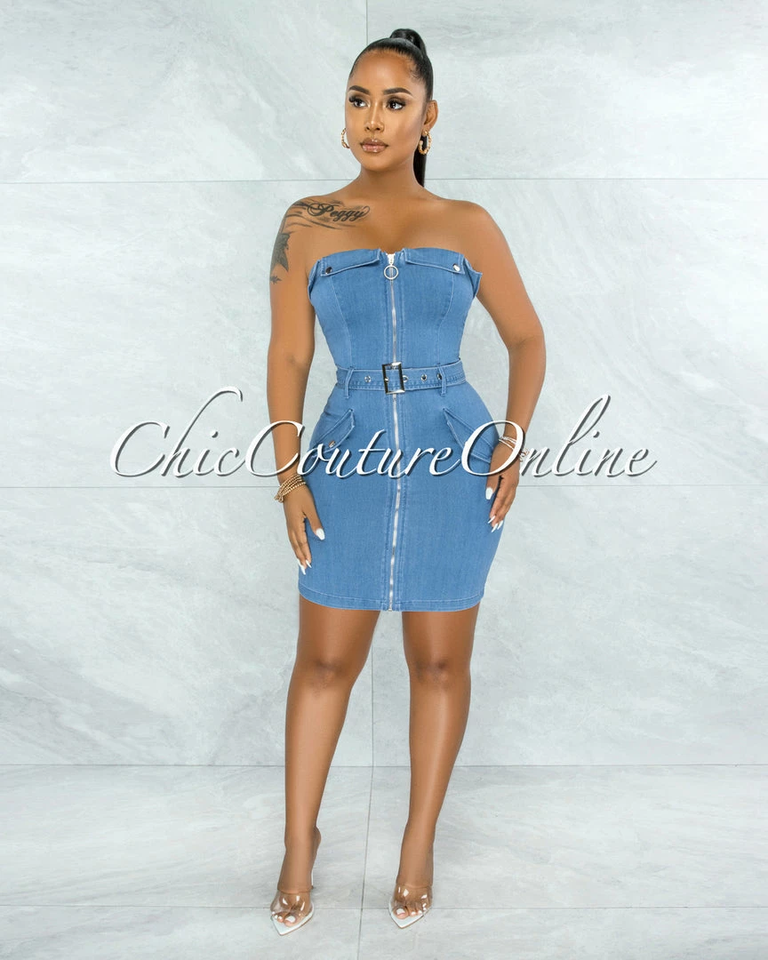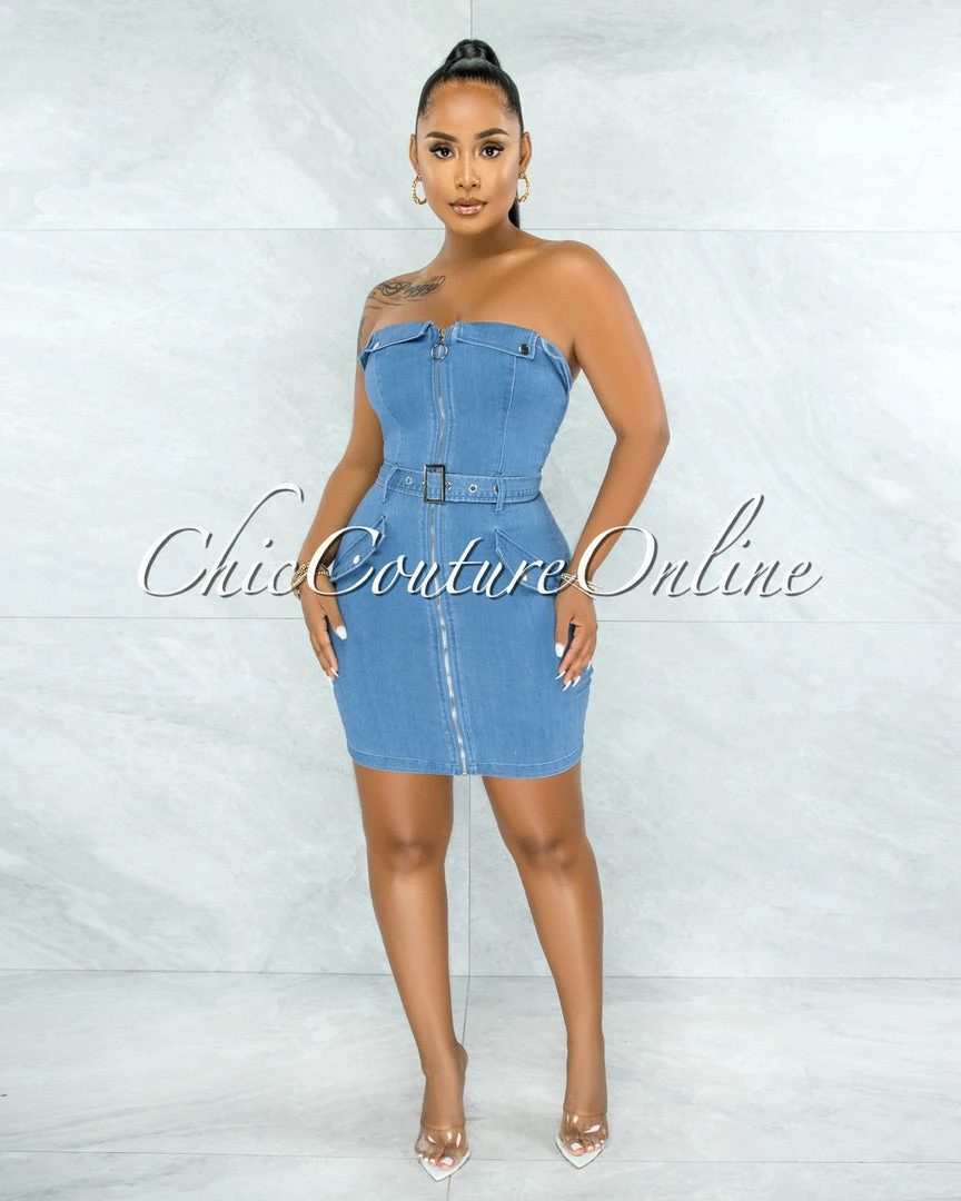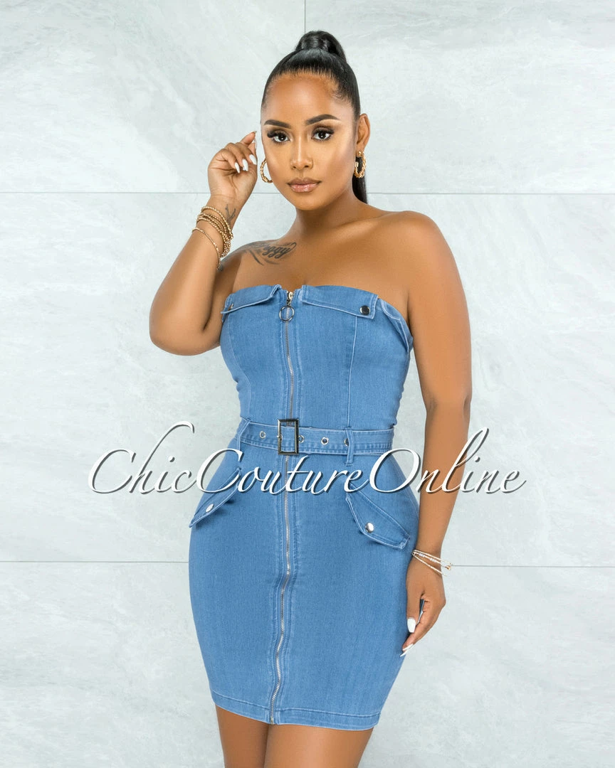 Update your occasion wardrobe with this flattering body-con dress. The denim construction forms to your curves and the zipper front design gives it a modern, on-trend look.