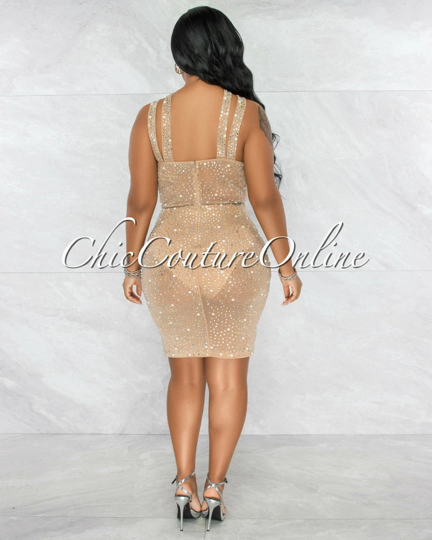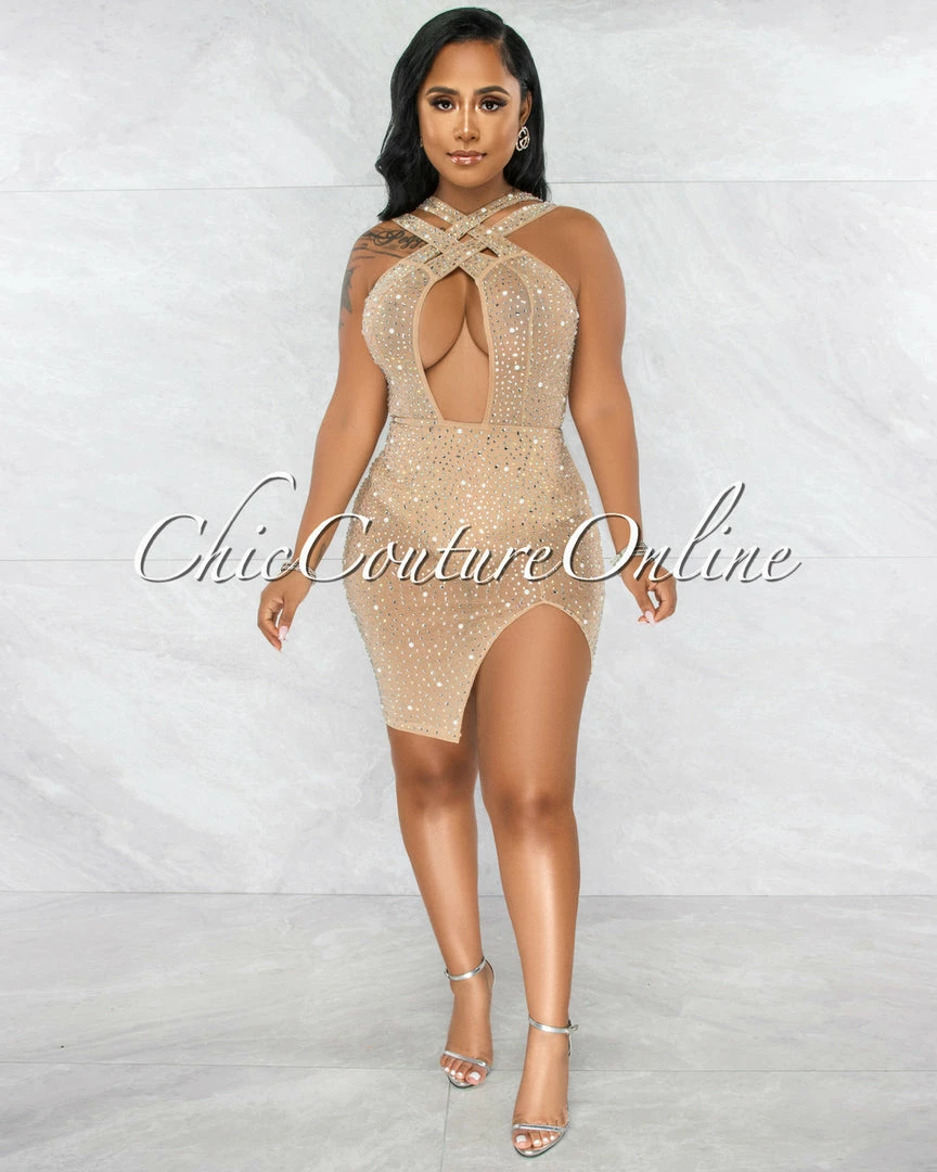 Vendor-unknown Hamidi Nude Rhinestones & Pearls Mesh Criss-Cross Dress