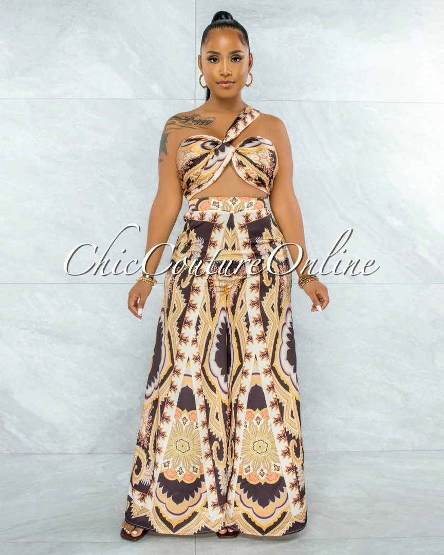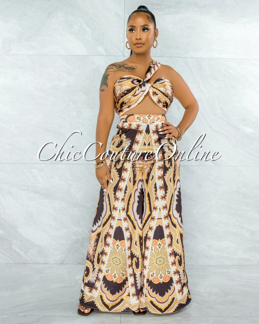 Vendor-unknown JUST IN Alston Brown Gold Print Multi-Way Top & Wide Legs Set