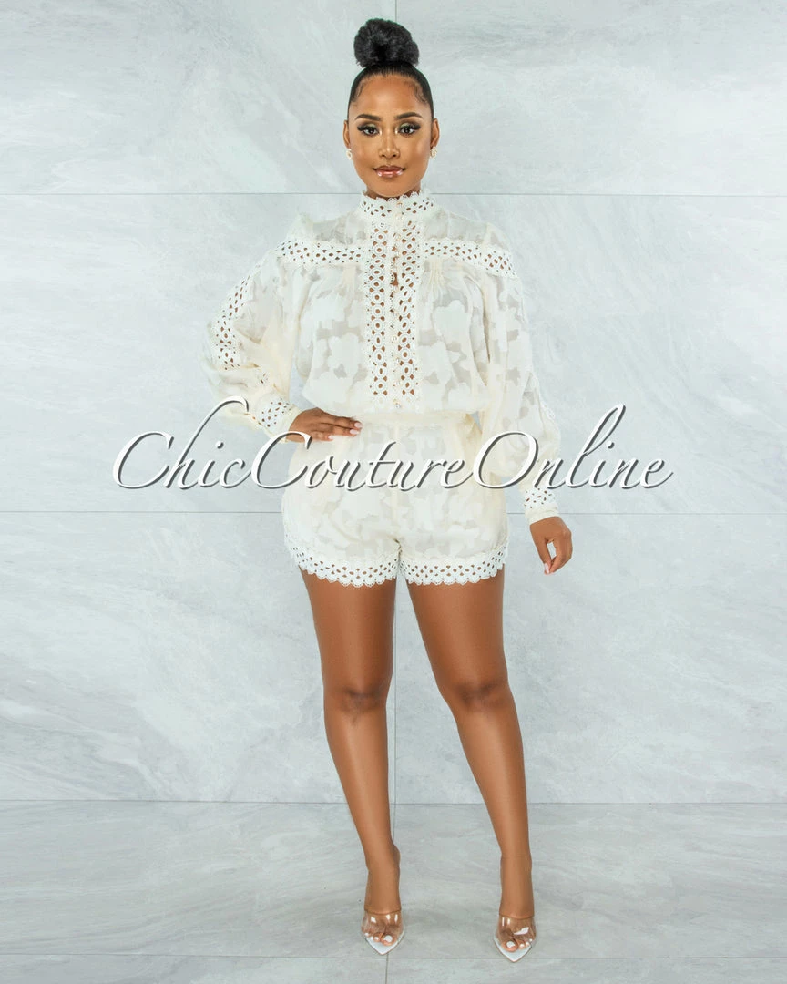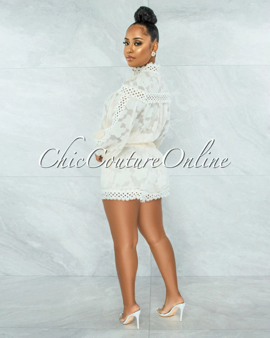 Vendor-unknown JUST IN Bansuri Ivory Crochet Pearl Sheer Blouse & Shorts Set