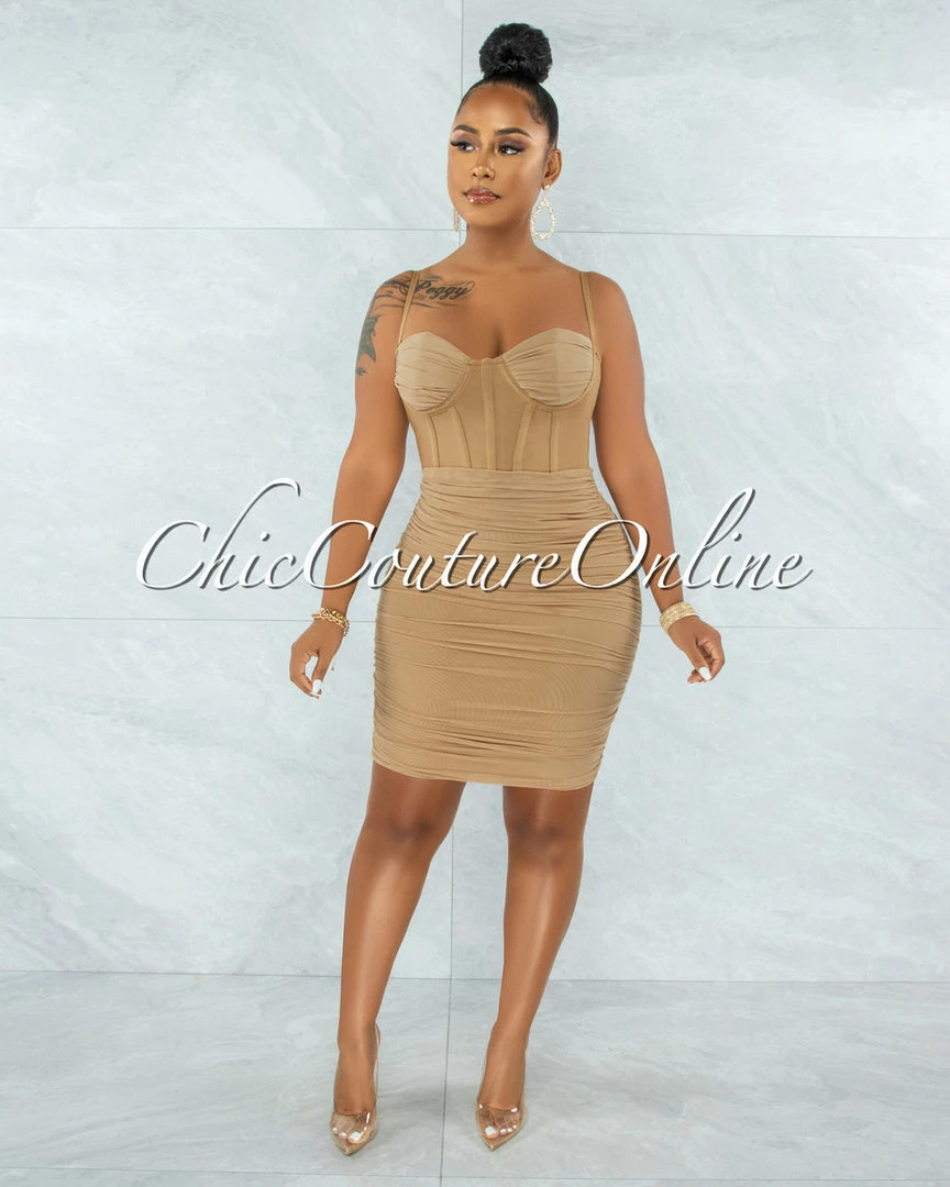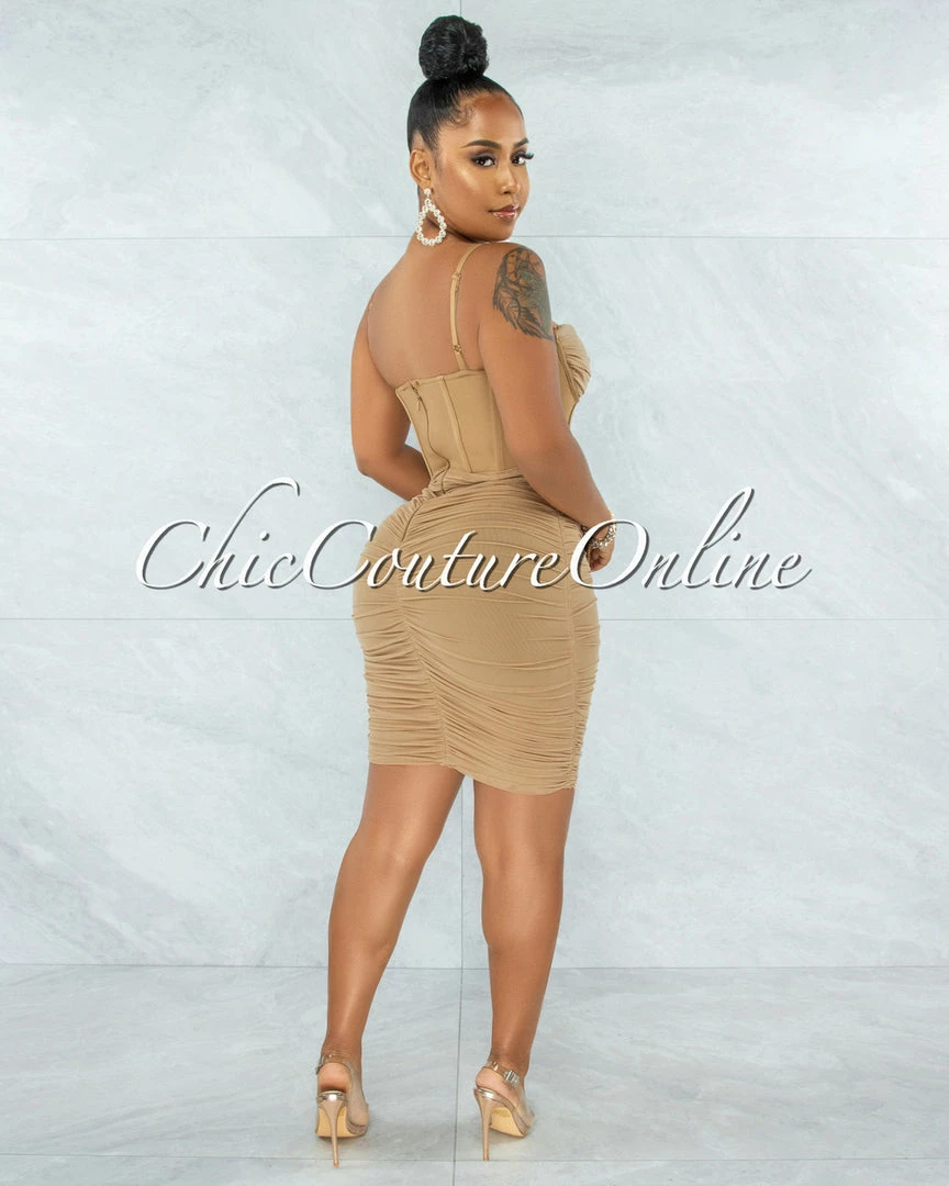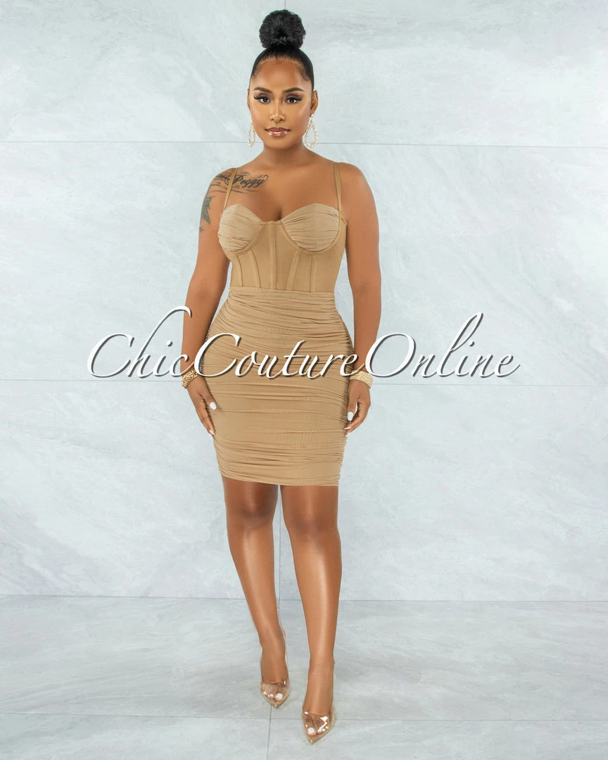 Vendor-unknown JUST IN Bassett Khaki Mesh Ruched Bandage Corset Dress