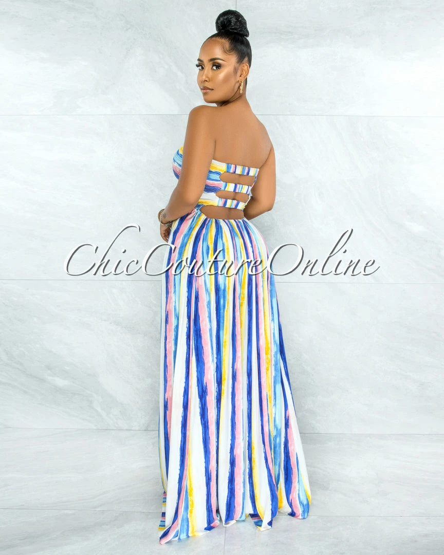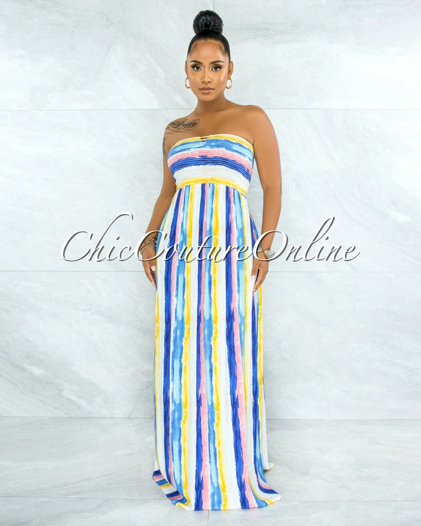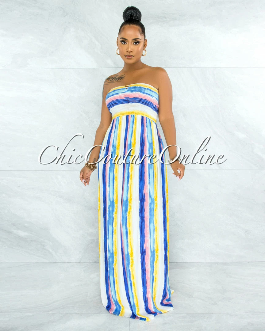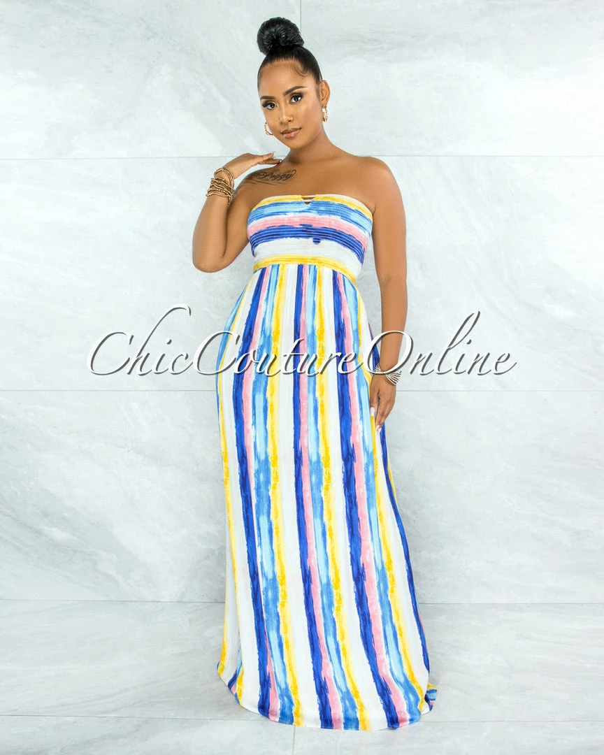 Vendor-unknown JUST IN Gardner Blue Yellow Stripes Smocked Strappy Back Maxi Dress