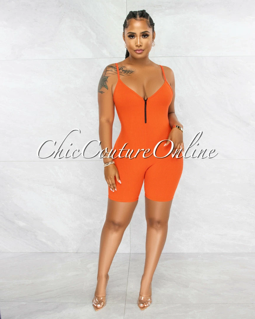 Vendor-unknown JUST IN Jerram Orange Ribbed Front Zipper Romper