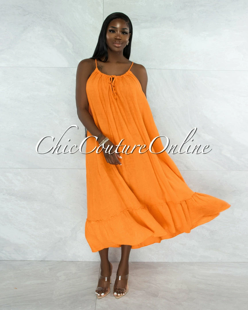 Vendor-unknown JUST IN Nassar Orange Braid Straps Ruffle Hem Maxi LINEN Dress