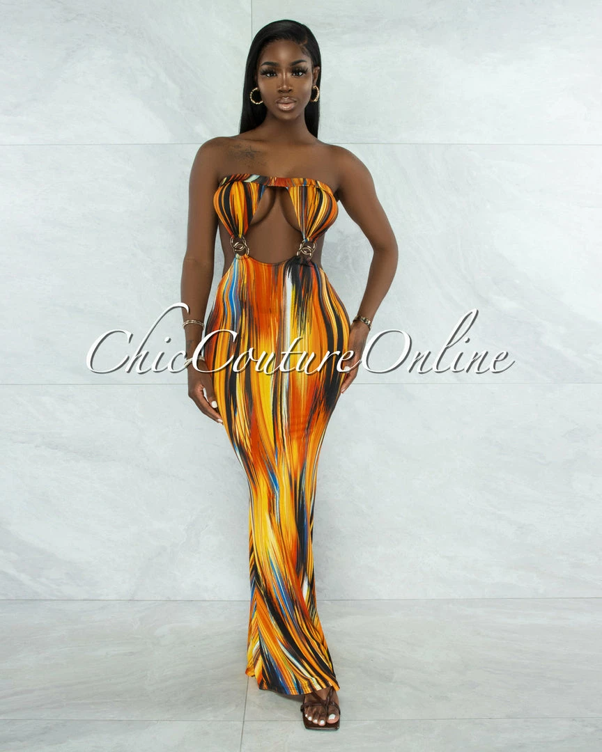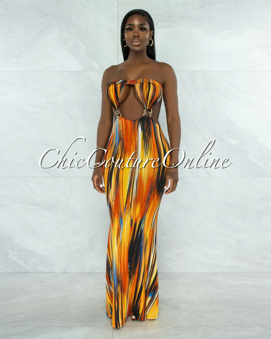 Vendor-unknown JUST IN Nesley Orange Black Print Cut-Out Gold Accent Maxi Dress