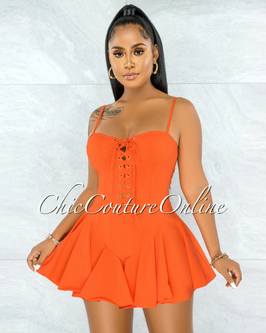 Vendor-unknown JUST IN Tiana Orange Lace-Up Ruffle Hem Bodysuit Mini Dress