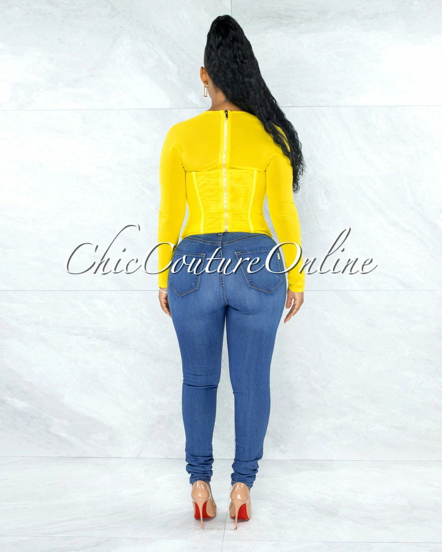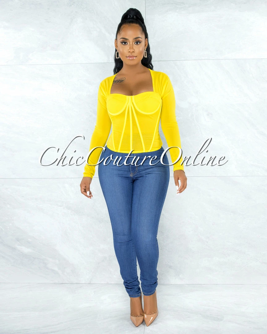 The corset is back, with a sleek update that’s both modern and sophisticated. Featuring denim construction, this high-fashion piece is ideal for layering or wearing alone.