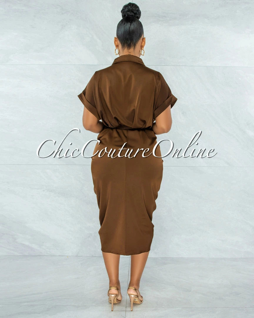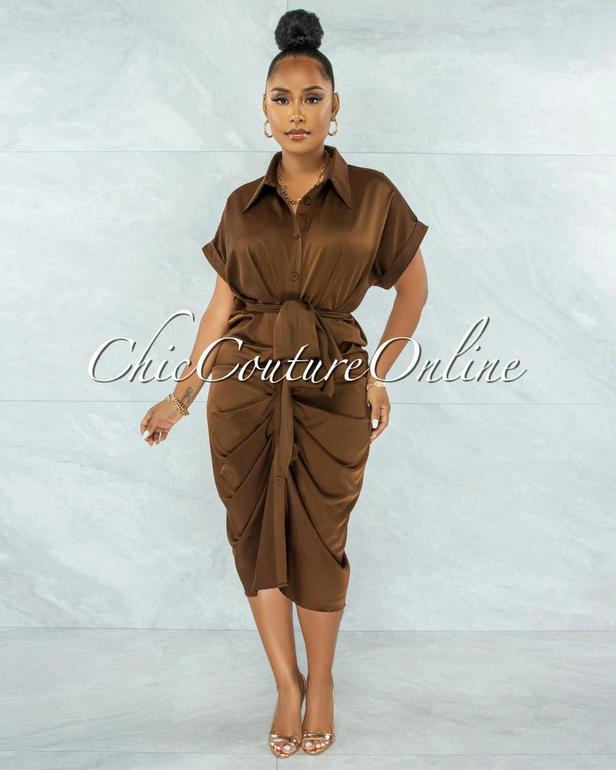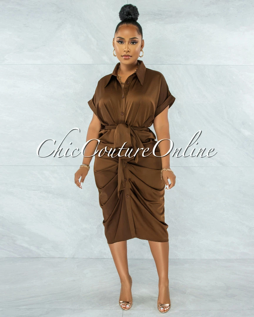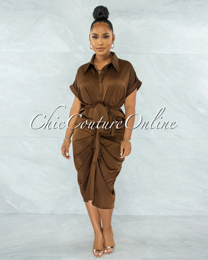 Vendor-unknown JUST IN Valley Brown Drape Self-Tie Belt Shirt Midi Dress