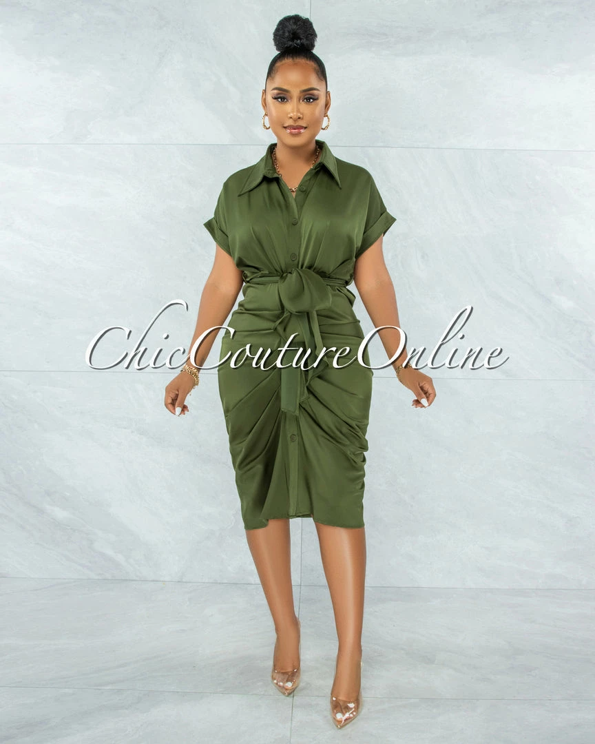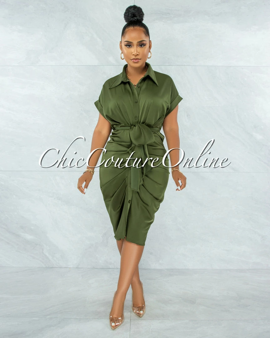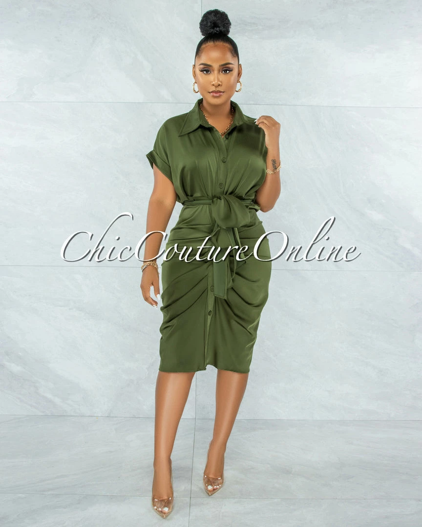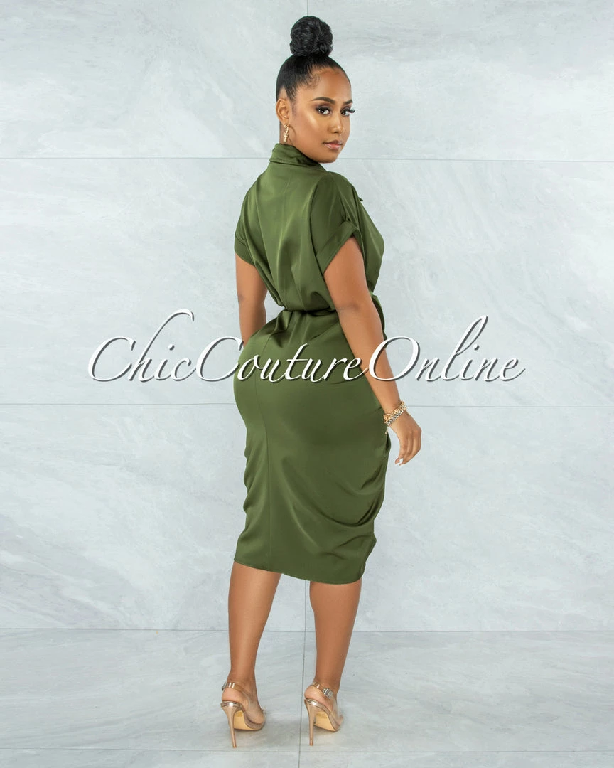 Vendor-unknown JUST IN Valley Olive Green Drape Self-Tie Belt Shirt Midi Dress