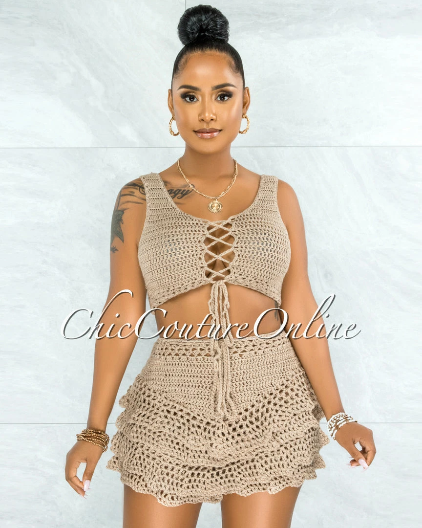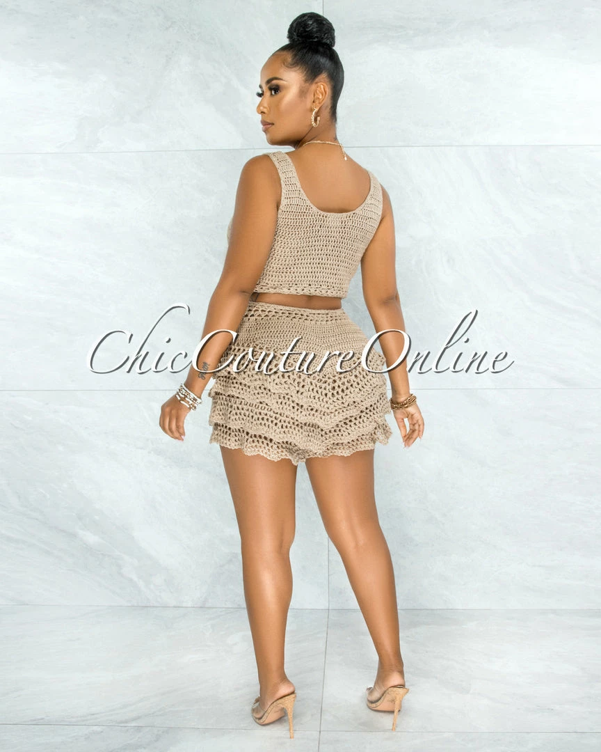 Vendor-unknown Leary Beige Crochet Cover-Up Ruffle Skort Set