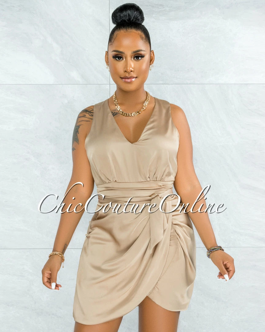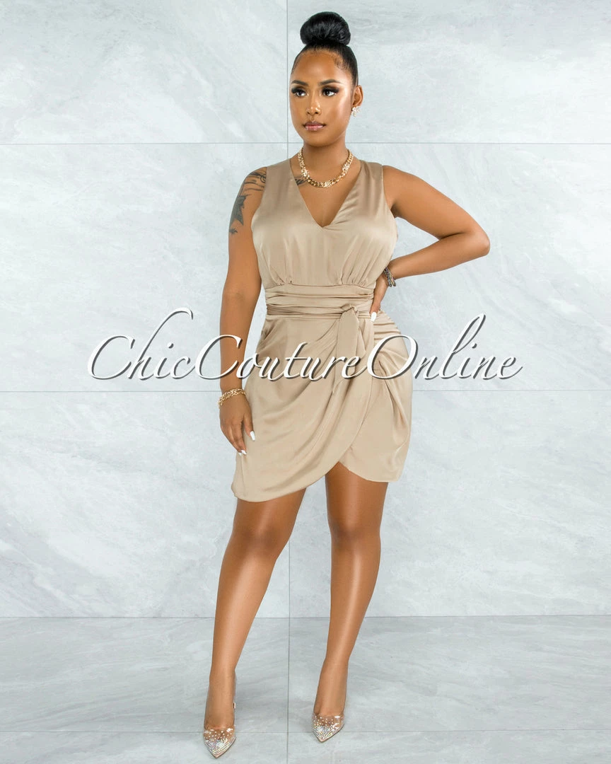 Vendor-unknown Pacifica Gold Draped Wrap Hem Mini Satin Dress JUST IN