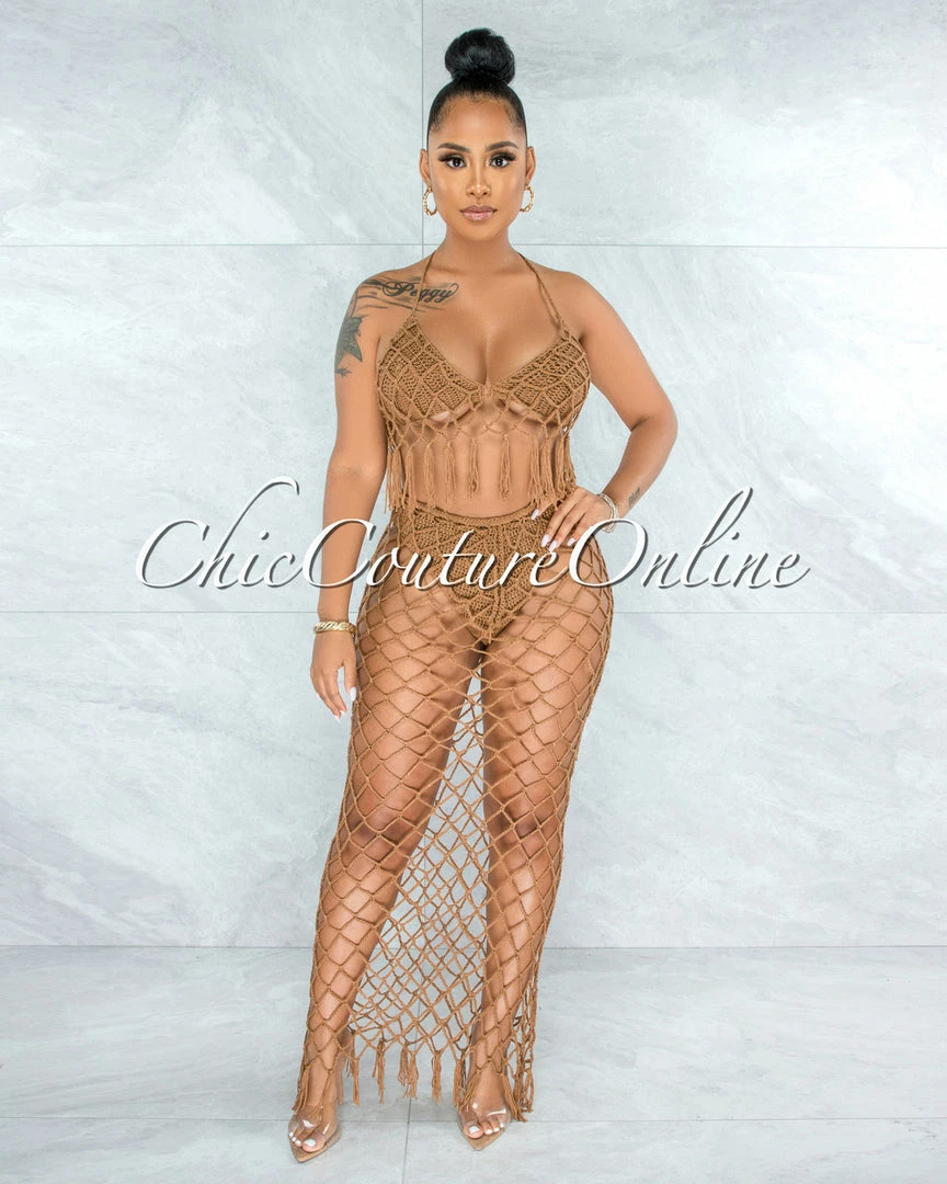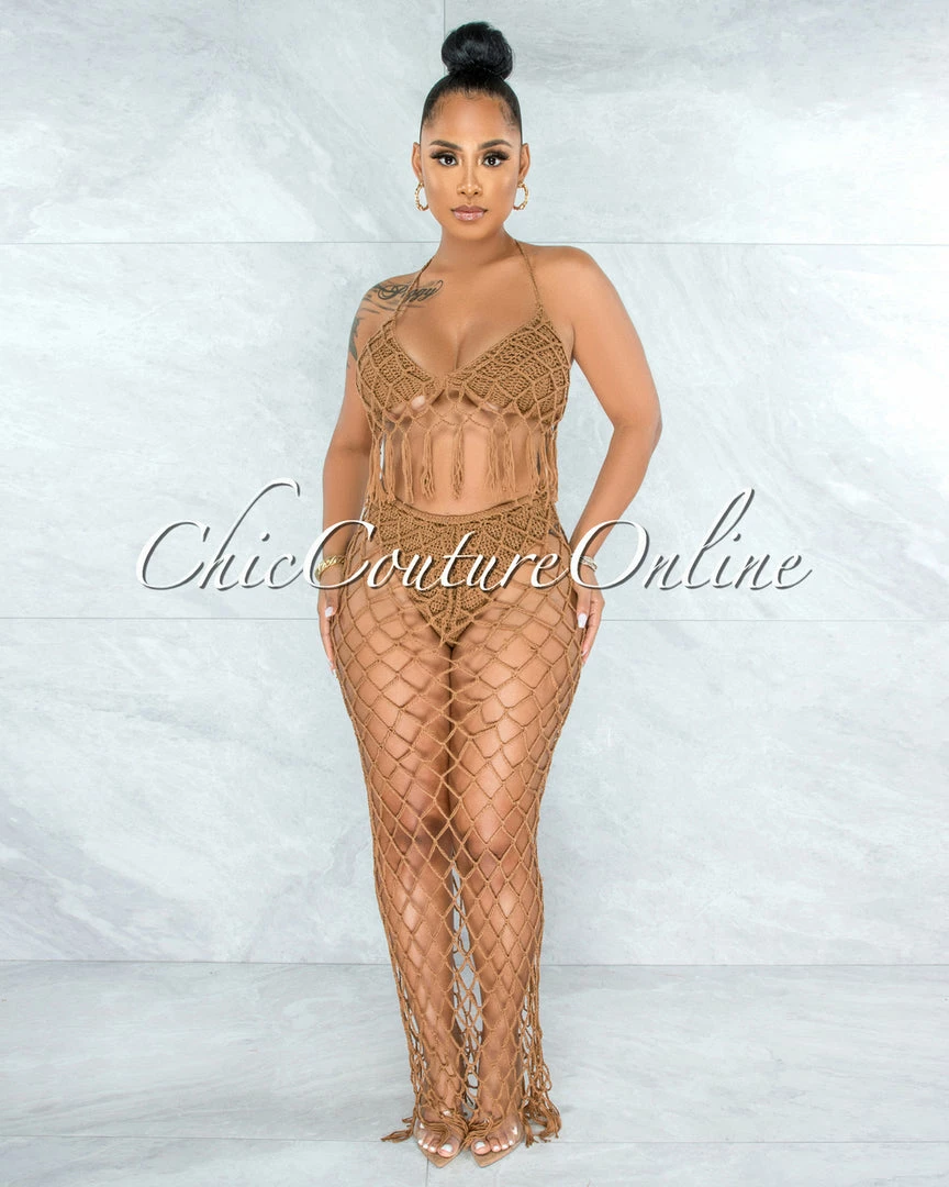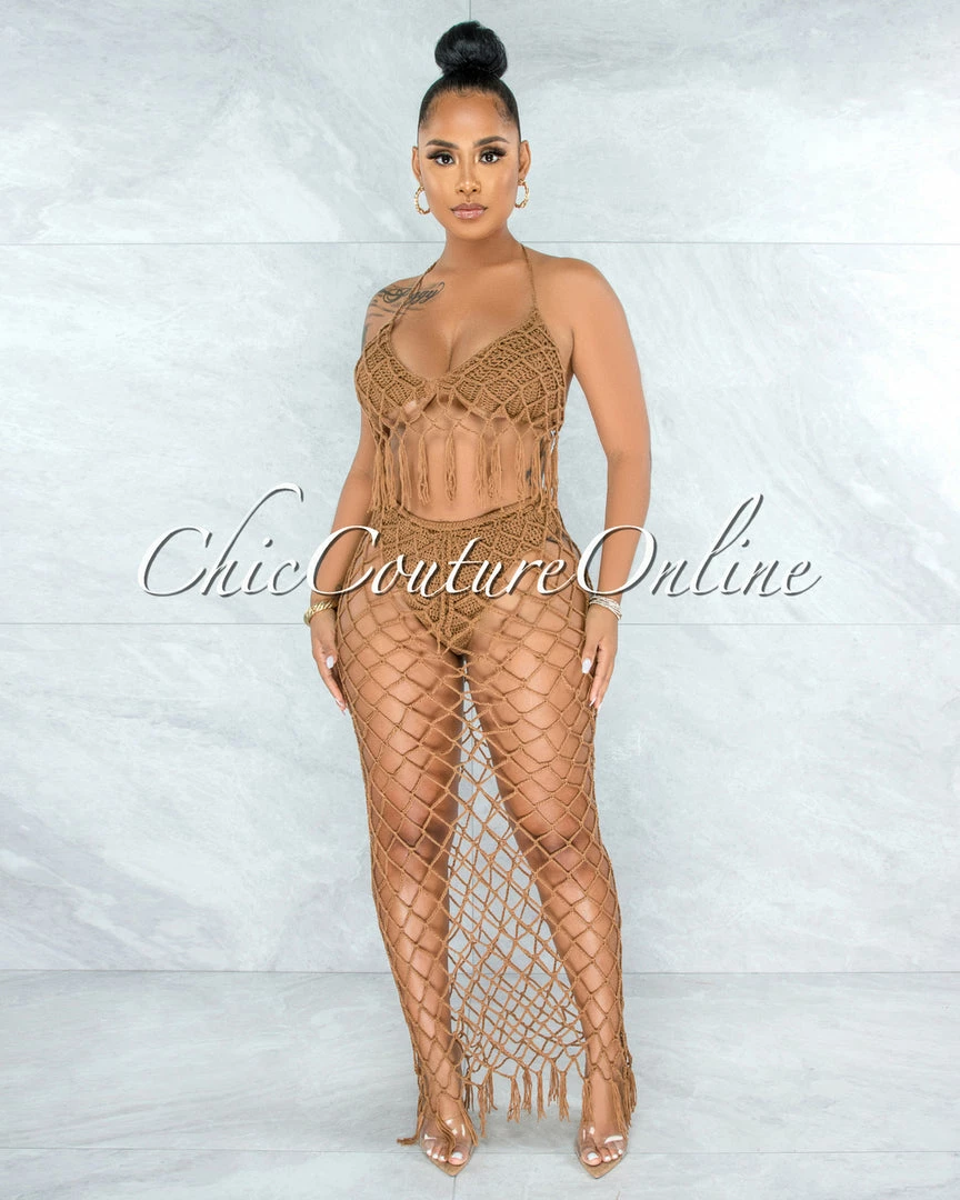 Crochet is the beach day way! Sexy open knit coverage gives way to a dramatically long, fringed hem, creating a whole lot of gorgeous movement.