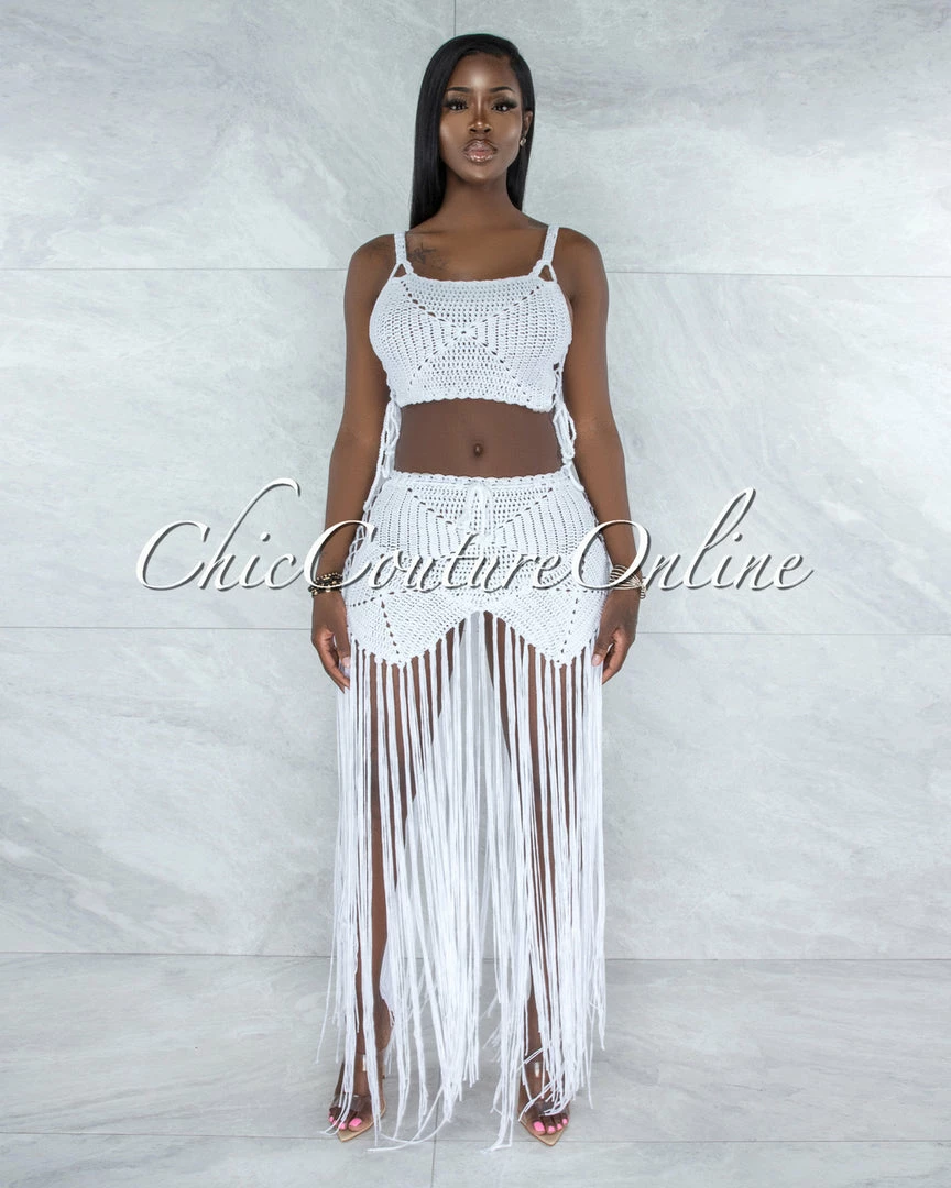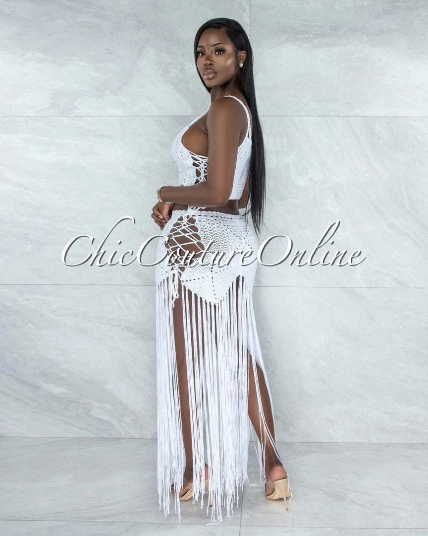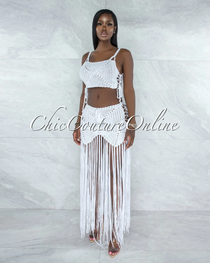 Crochet is the beach day way! Sexy open knit coverage gives way to a dramatically long, fringed hem, creating a whole lot of gorgeous movement.