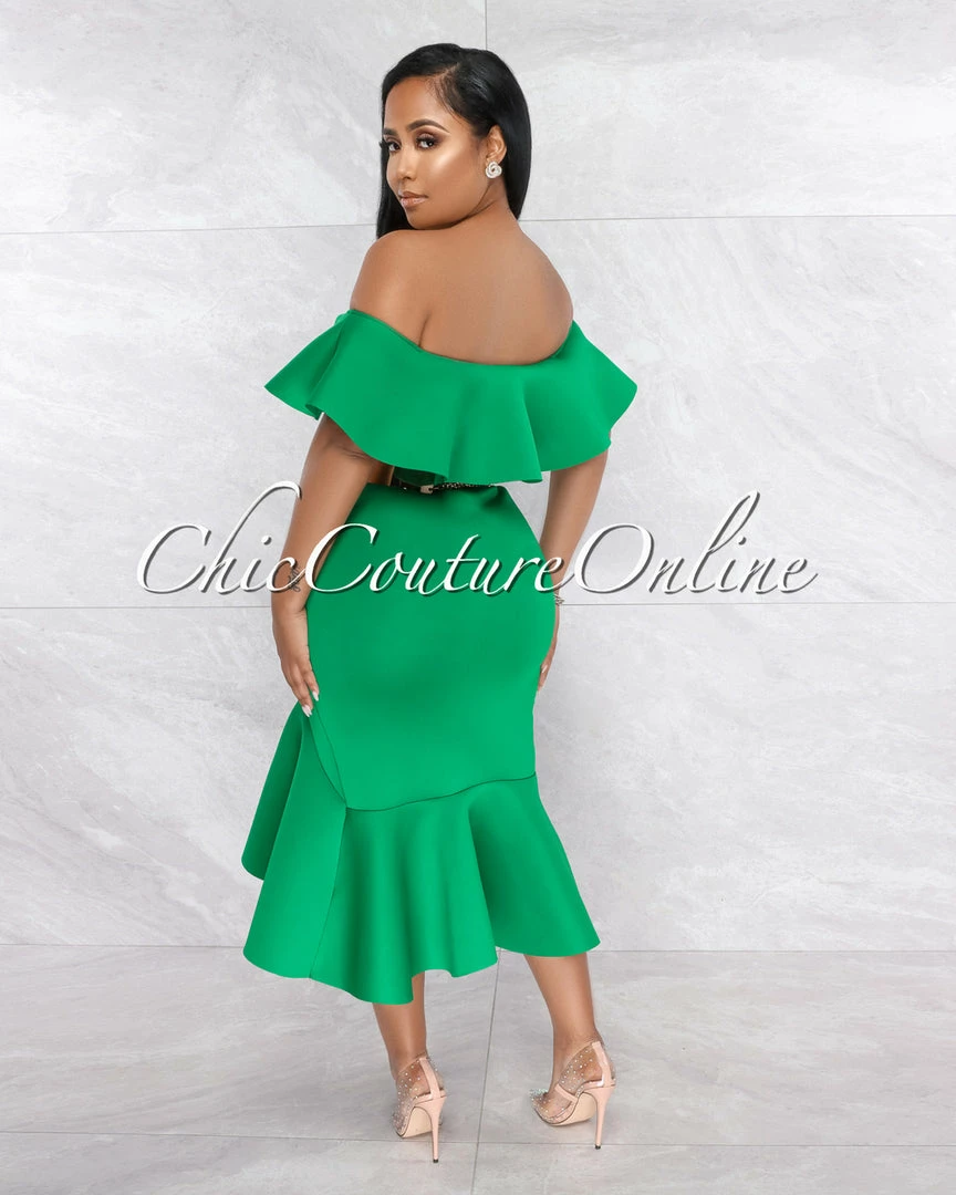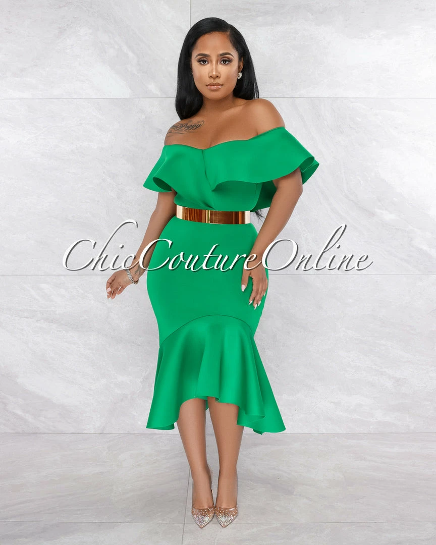 Rendered in the season’s most coveted ponti fabric, this off-the-shoulder dress charms with a modern ruffle design.
